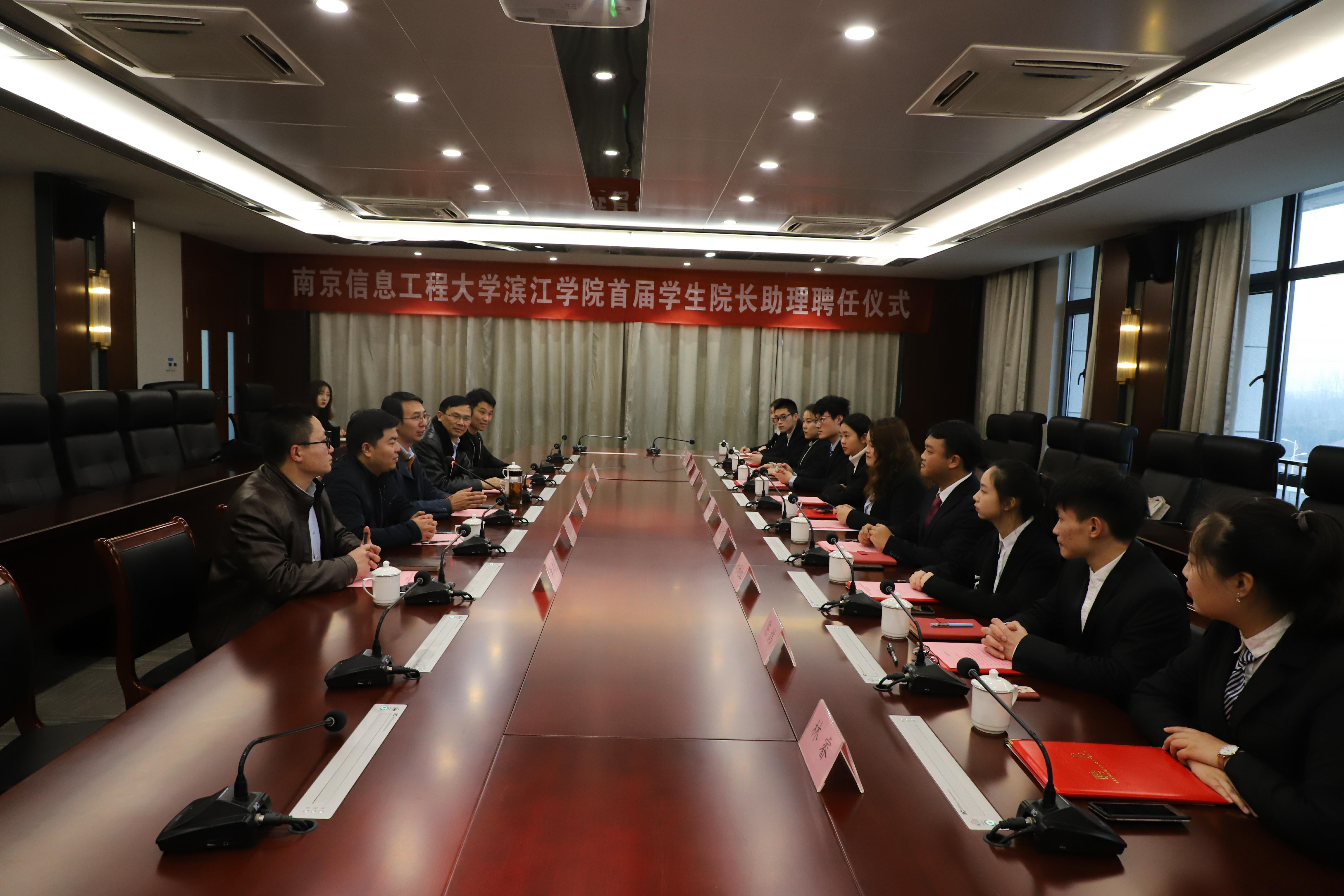 李磊主任介绍了首届学生院长助理选聘情况。张灿龙副书记宣读了《关于聘任南京信息工程大学滨江学院首届学生院长助理的决定》。曹广喜院长向10名首届学生院长助理逐一颁发聘书。