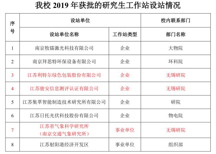 近日,省教育厅、科技厅公布了2019年江苏省研究生工作站获批名单,我校共获批8项。无锡研究院、无锡研究生院初次参与送审,与江苏利特尔绿色包装有限公司、江苏骏安信息测评认证有限公司及江苏省气象科学研究所(南京交通气象研究所)联合申报的3个研究生工作站成功获批。