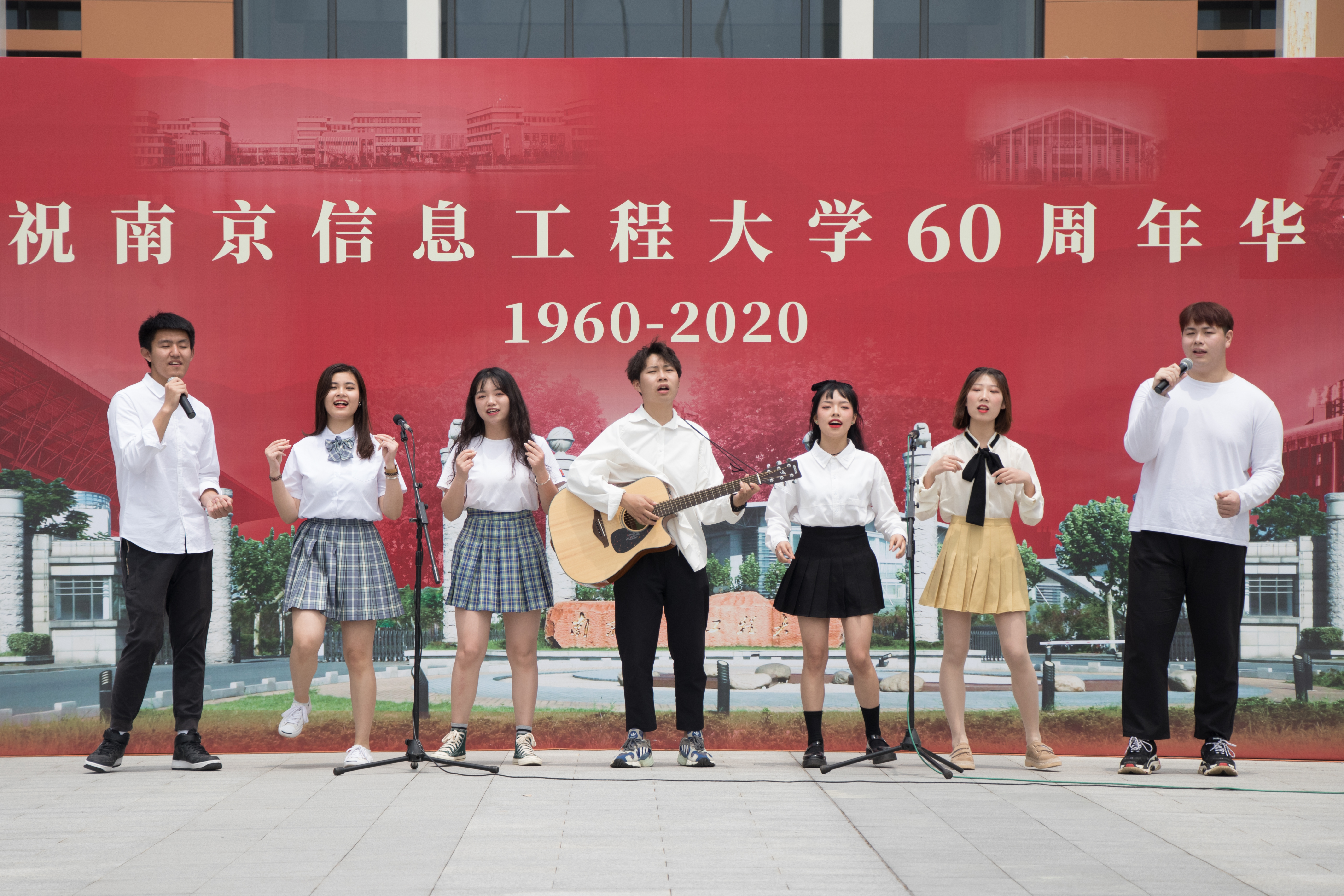 直播结束后,校庆露天文艺演出在滨江大礼堂南广场精彩上演。演出共包括五个精彩节目,展现了南信大六十年风雨兼程,歌颂了一代代南信大人砥砺奋进取得的辉煌成就。演出最后,在场师生分享校庆蛋糕及小饼干,共同为南信大甲子华诞献上热情祝福。