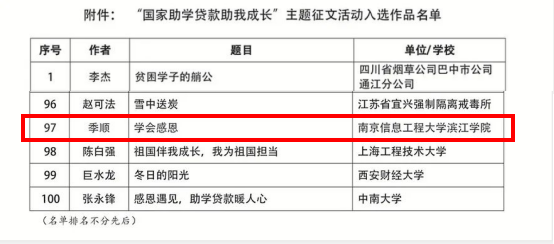 10月12日,全国学生资助管理中心发布“国家助学贷款助我成长”主题征文活动入选作品名单,我院大气与遥感学院2019级地理信息科学专业的季顺同学作品从全国35612篇作品中脱颖而出入选100篇获奖名单。