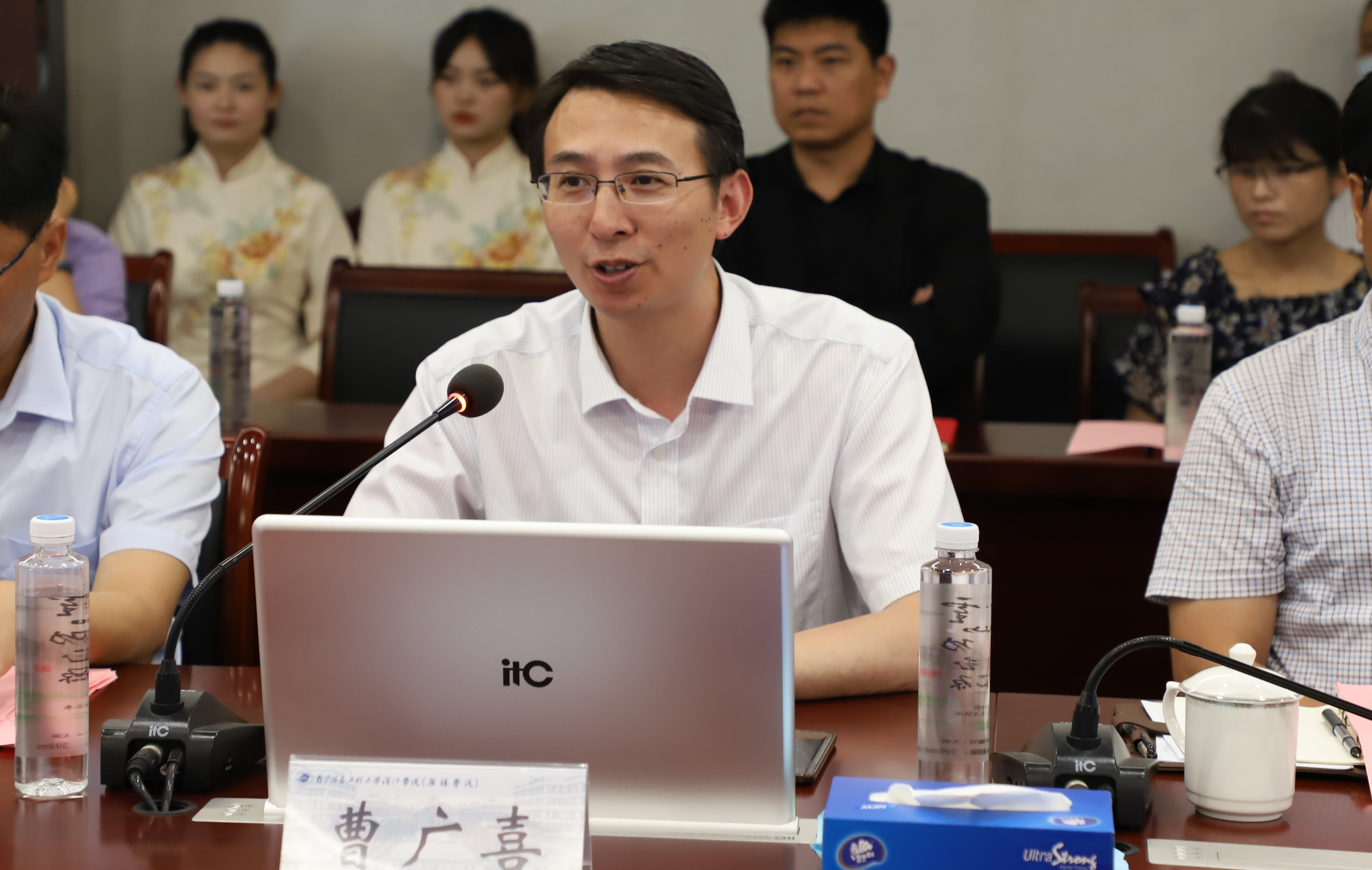 曹广喜以“校企合作 共建共赢”为主题,从南京信息工程大学和滨江学院的办学沿革、滨江学院建设一流创新应用型大学的发展理念、学院目前的机制体系、校区状况、十大亮点等方面介绍了学院情况,从七个方面详细阐述了产学研合作的基础,从产业学院建设、联合人才培养、科研合作、实习实训、双聘导师产业教授、就业创业基地等六个方面寄予了合作愿景。