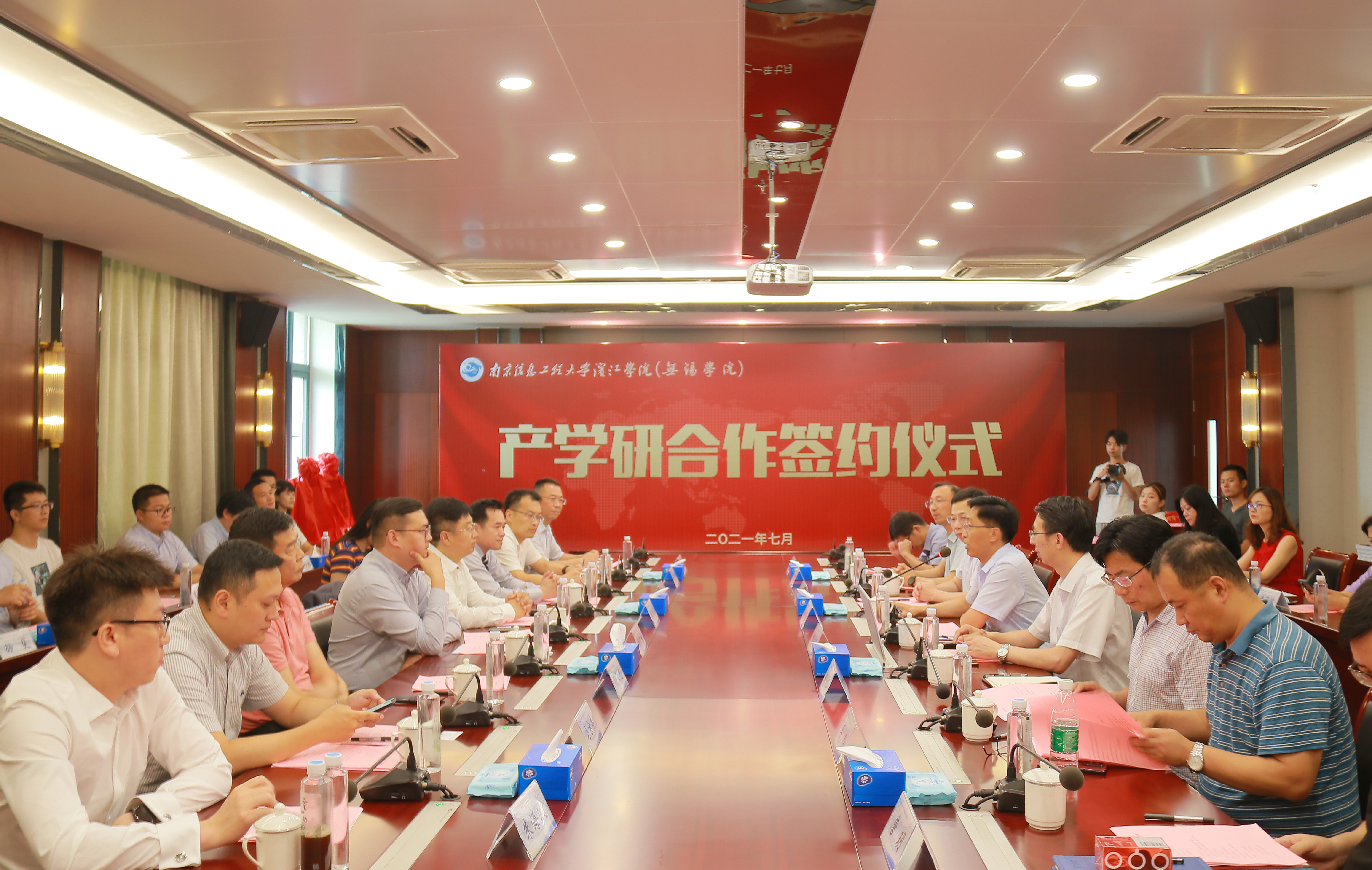 7月9日,我院在行政楼525会议室隆重举行产学研合作集体签约仪式。大连东软教育科技集团有限公司高级副总裁李印杲、沈阳中德新松教育科技集团有限公司高级副总裁Andy Pan、慧科教育科技集团有限公司副总裁徐功东、无锡信捷电气股份有限公司副总经理陈世恒、江苏智行未来汽车研究院有限公司董事长孙玉志、江苏省未来网络创新研究院合作总监马宗杰、无锡锡商银行股份有限公司副行长徐卫东、深南(无锡)车联网有限公司发展总监朱海波、无锡新松机器人自动化股份有限公司技术总监李军华等企业高管及代表共17人,南京信息工程大学党委常委、副校长张永宏、南京信息工程大学滨江学院院长曹广喜、副院长齐运锋、教务处处长钱承山、实验室与设备管理处处长丁留贯、自动化学院院长李鹏、商学院院长陈理飞、物联网工程学院副院长唐玥及二级学院相关人员出席签约仪式,签约仪式由齐运锋副院长主持。