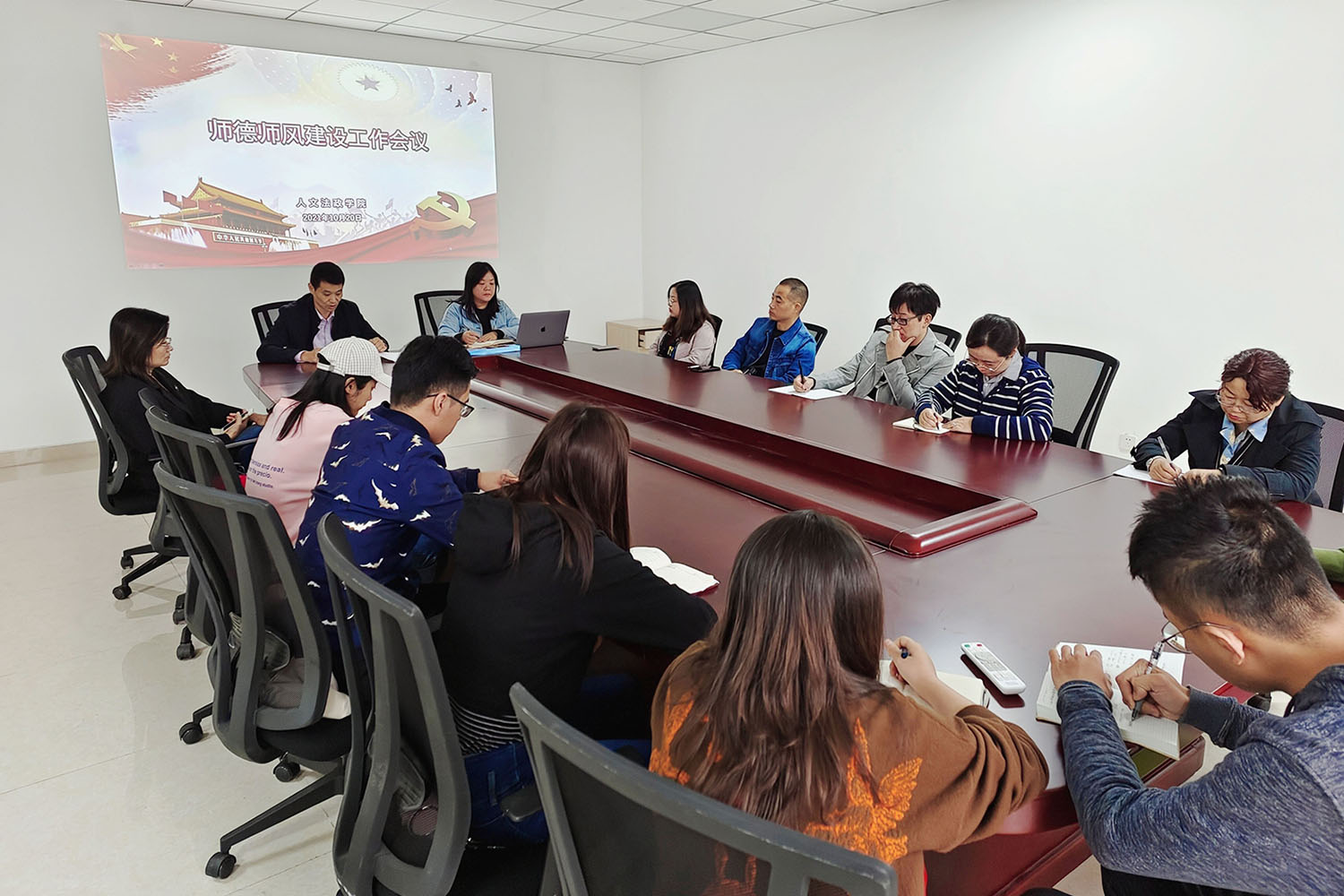 人文法政学院党总支书记李磊首先以党史学习教育为主线,带领大家进行“四史”学习,引导教师们坚定理想信念、厚植爱国情怀、涵养高尚师德。随后,李磊结合我院师德师风建设情况,领学习近平总书记关于师德师风的重要论述摘编及新时代高校教师职业行为十项准则,从坚定政治方向、自觉爱国守法、传播优秀文化、潜心教书育人、关心爱护学生、坚持言行雅正、遵守学术规范、秉持公正诚信、坚守廉洁自律、积极奉献社会等十个方面进行了解读和概括,并强调全院教师要认真体会,严格落实立德树人的根本要求,进一步增强教书育人的责任感、使命感和荣誉感。