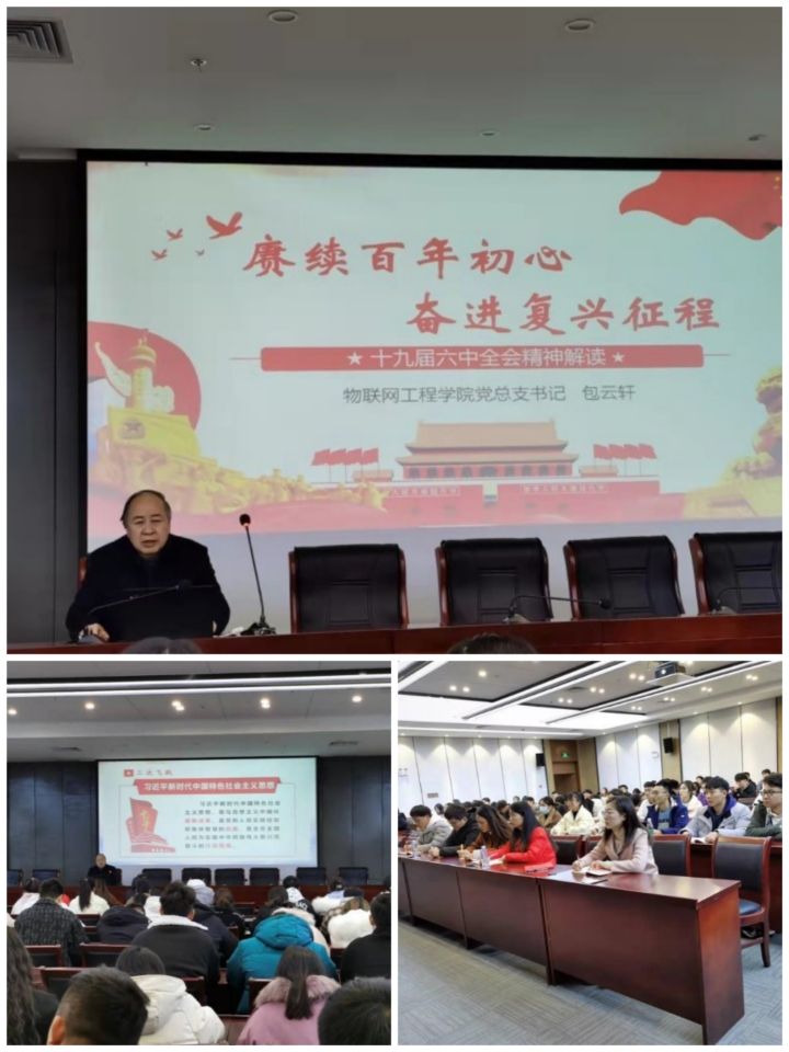 为了深入学习贯彻党的十九届六中全会精神,扎实推进党史学习教育,12月1日下午,物联网工程学院在大礼堂103举办“赓续百年初心奋进复兴征程”主题党课,物联网工程学院党总支书记包云轩为学院全体教职工党员、学生党员解读了十九届六中全会精神。