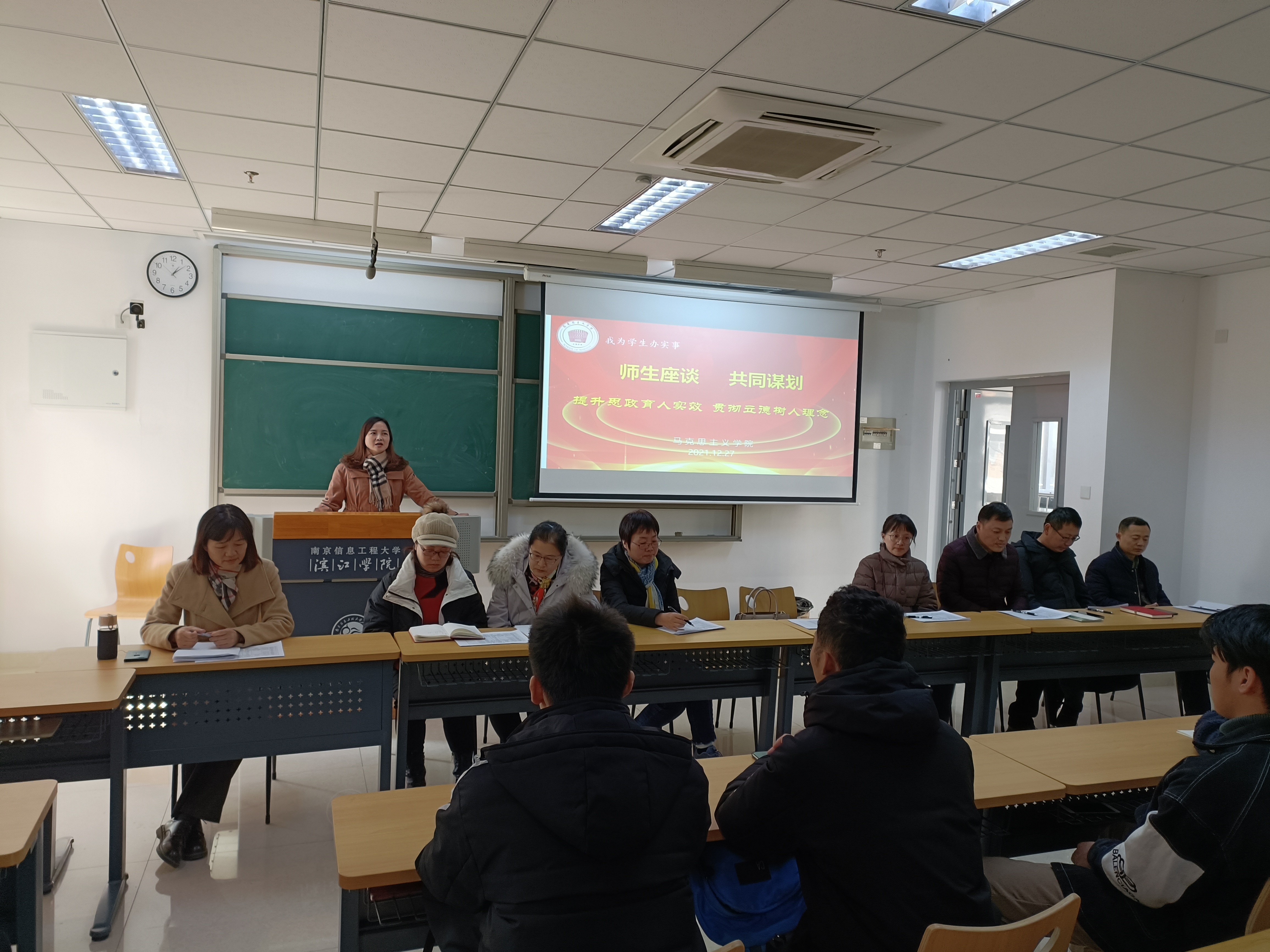 为贯彻学校立德树人根本任务,提升思政育人实效,12月27日下午,马克思主义学院在尚真楼204召开“提升思政课教学质量”主题座谈会,倾听学生心声,回应学生期待。马克思主义学院负责人王玉萍在师生座谈会上发表了主题讲话,座谈会由思政教研室主任张毅老师主持,我院全体教师出席了此次座谈会。