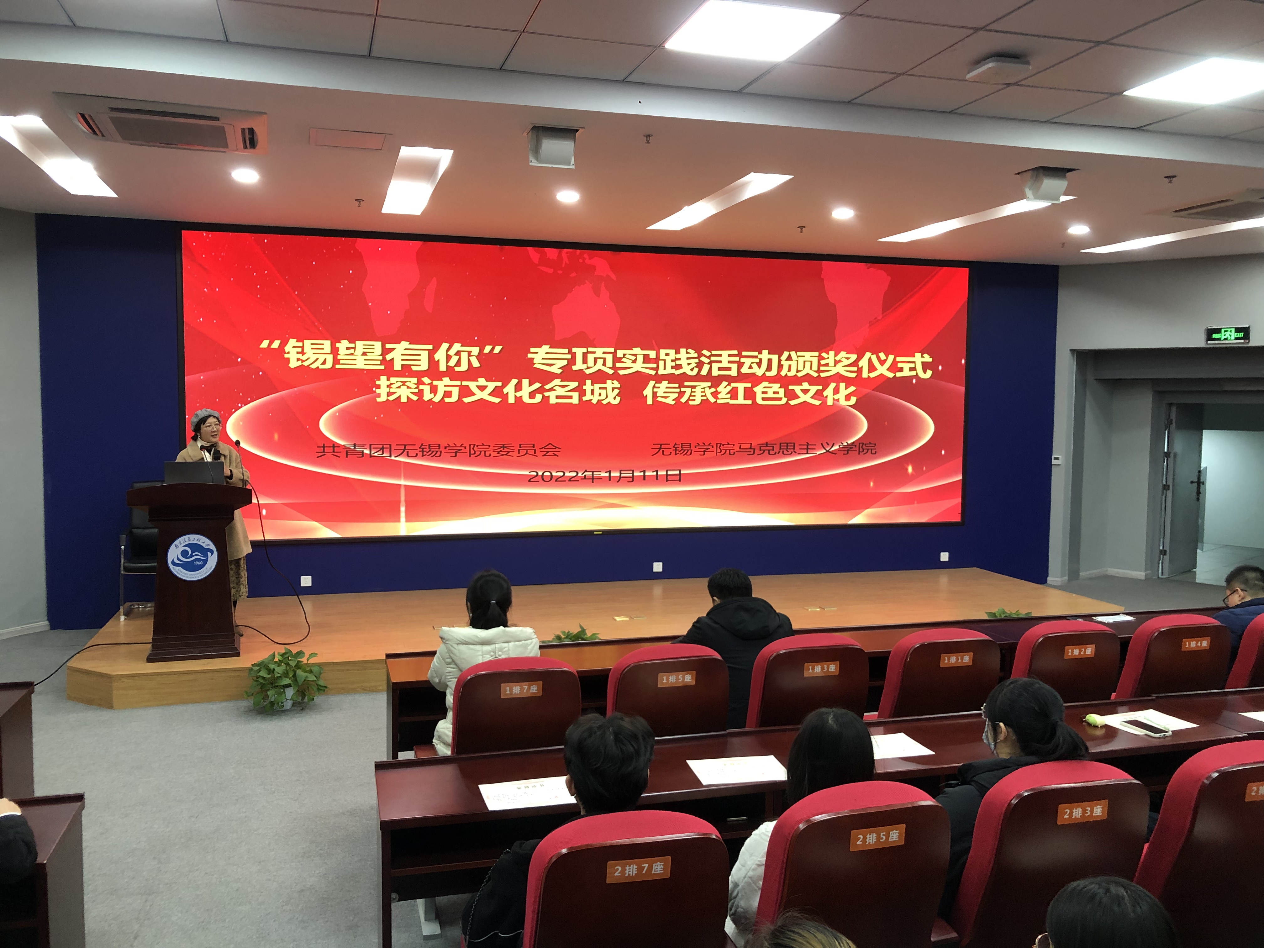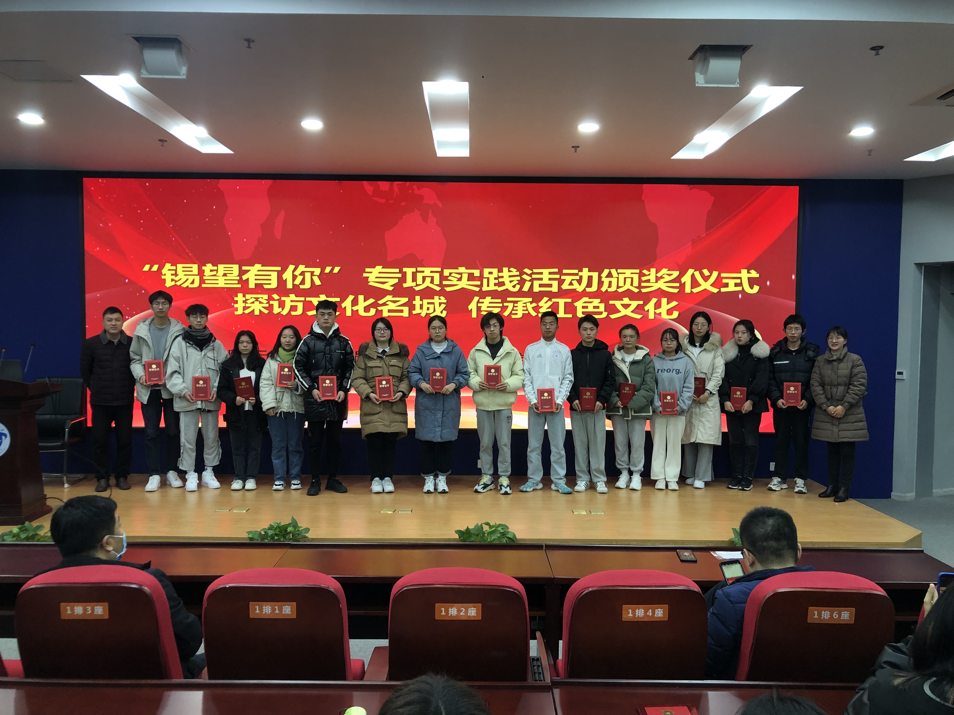 1月11日晚,马克思主义学院在科创楼二楼报告厅举办了“锡望有你”专项实践活动颁奖仪式。活动特邀校党委宣传部负责人程艳丽、校学工处负责人张灿龙、校团委负责人李沛武作为颁奖嘉宾。活动由马克思主义学院思政教研室主任瞿华主持,马克思主义学院全体教师和来自各二级学院的获奖学生代表参加活动。