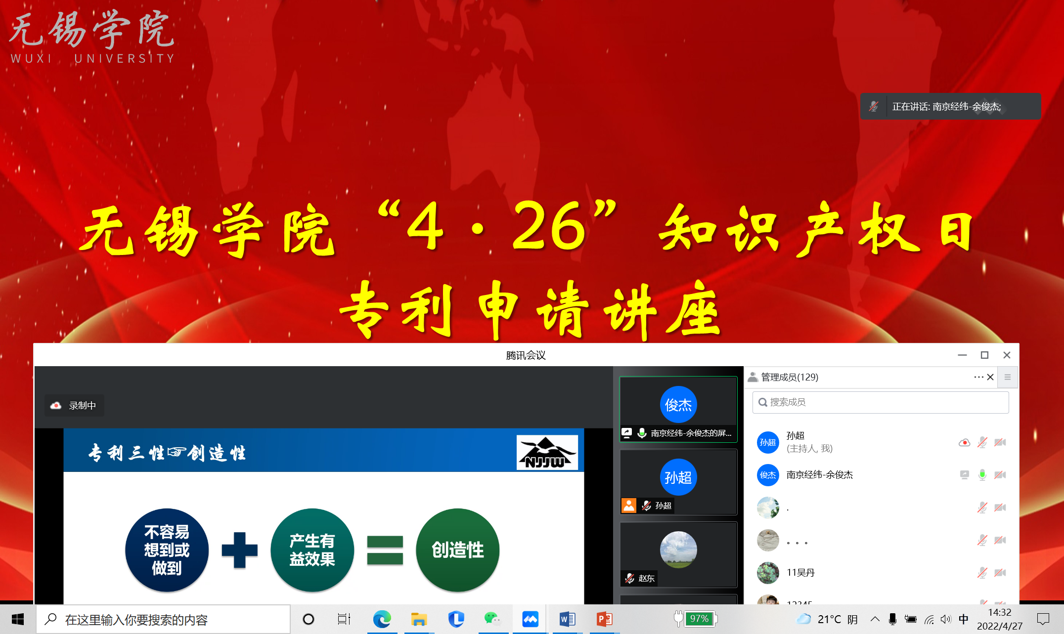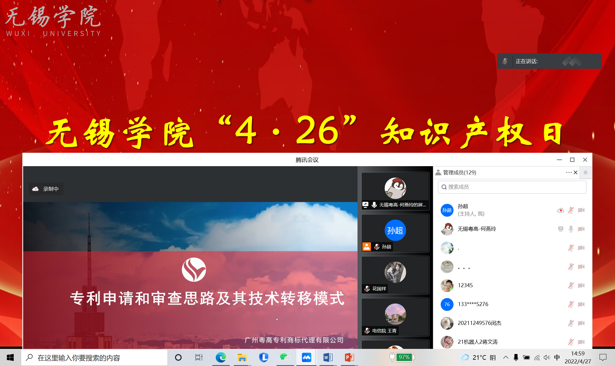 4月27日下午,科技处特邀南京经纬专利商标代理有限公司无锡分公司代理部部长余俊杰和广州粤高专利商标代理有限公司高级顾问何燕玲为我校师生带来专利申请培训讲座,按照疫情防控要求,讲座采用线上会议形式。科技处负责人丁留贯、科技处知识产权管理人员、各学院科研秘书、教师、学生参加讲座,讲座由丁留贯主持。