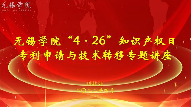 为深入贯彻落实习近平总书记关于知识产权工作的重要指示论述和《教育部 国家知识产权局 科技部<关于提升高等学校专利质量促进转化运用的若干意见>》(教科技〔2020〕1号)的精神,增强我校师生知识产权保护意识,高效促进知识产权运用,进一步加强科研人员对知识产权和技术转移相关政策的了解,服务我校新时期发展规划,不断提升我校专利申请的质量和获准率,规避非正常专利申请,在第22个世界知识产权日来临之际,联合锡山区市场监督管理局组织开展了 “4·26知识产权宣传周”系列活动。