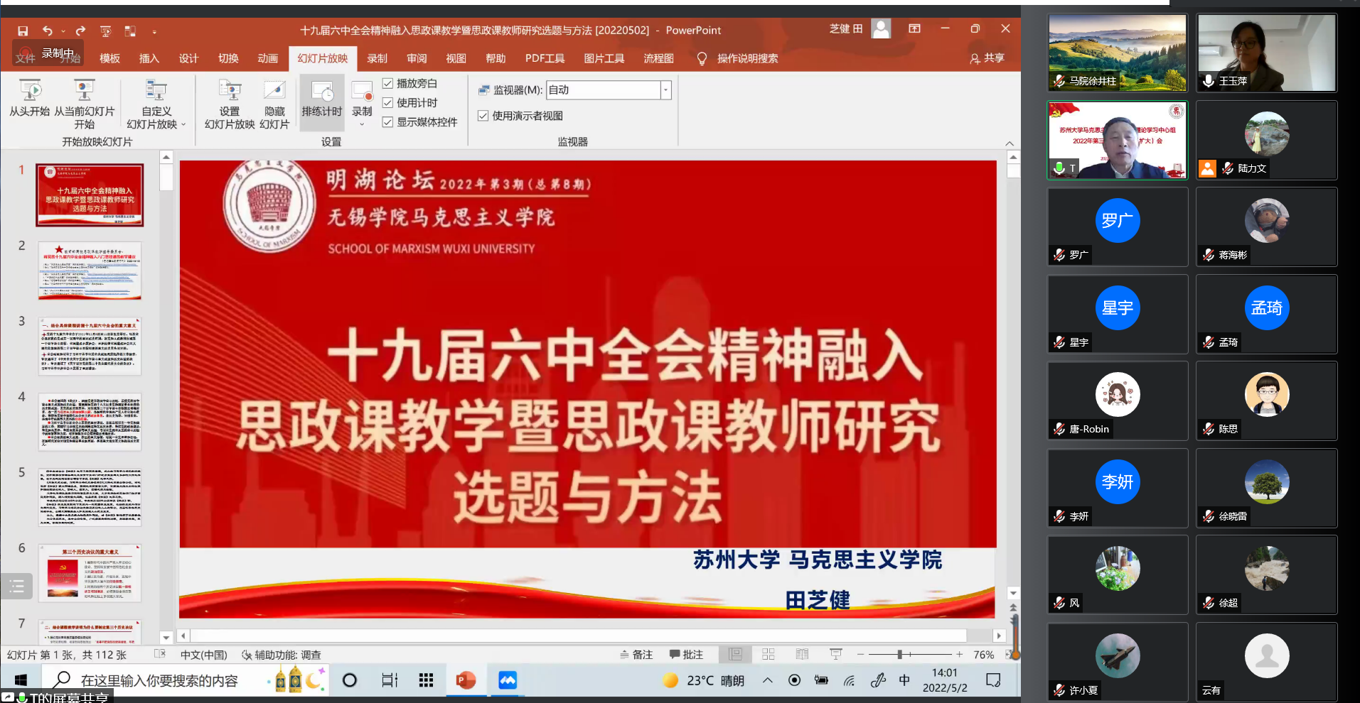为深入贯彻落实党的十九届六中全会精神并将全会精神准确融入思政课,5月2日下午,马克思主义学院特邀苏州大学马克思主义学院院长、博士生导师田芝健教授为马院教师作题为“十九届六中全会精神融入思政课教学暨思政课教师研究选题与方法”的专题讲座。本次讲座由马克思主义学院负责人王玉萍主持,马院全体教师通过腾讯会议在线直播的方式参加了本次讲座。
