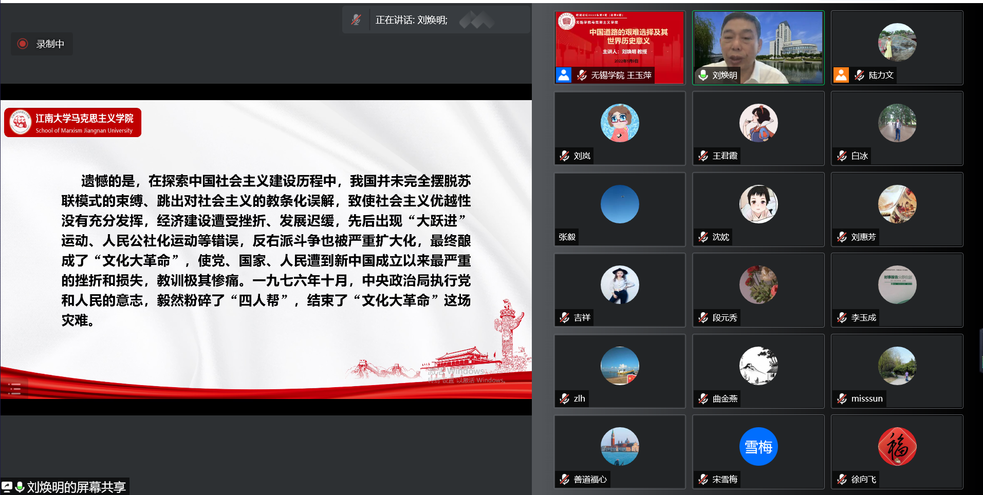 5月9日下午,江南大学马克思主义学院院长刘焕明教授应邀为马克思主义学院教师作题为“中国道路的艰难选择及其世界历史意义”的专题讲座,本次讲座由马克思主义学院负责人王玉萍主持,讲座采用腾讯会议线上直播的方式开展,我院全体教师参加了本次讲座。