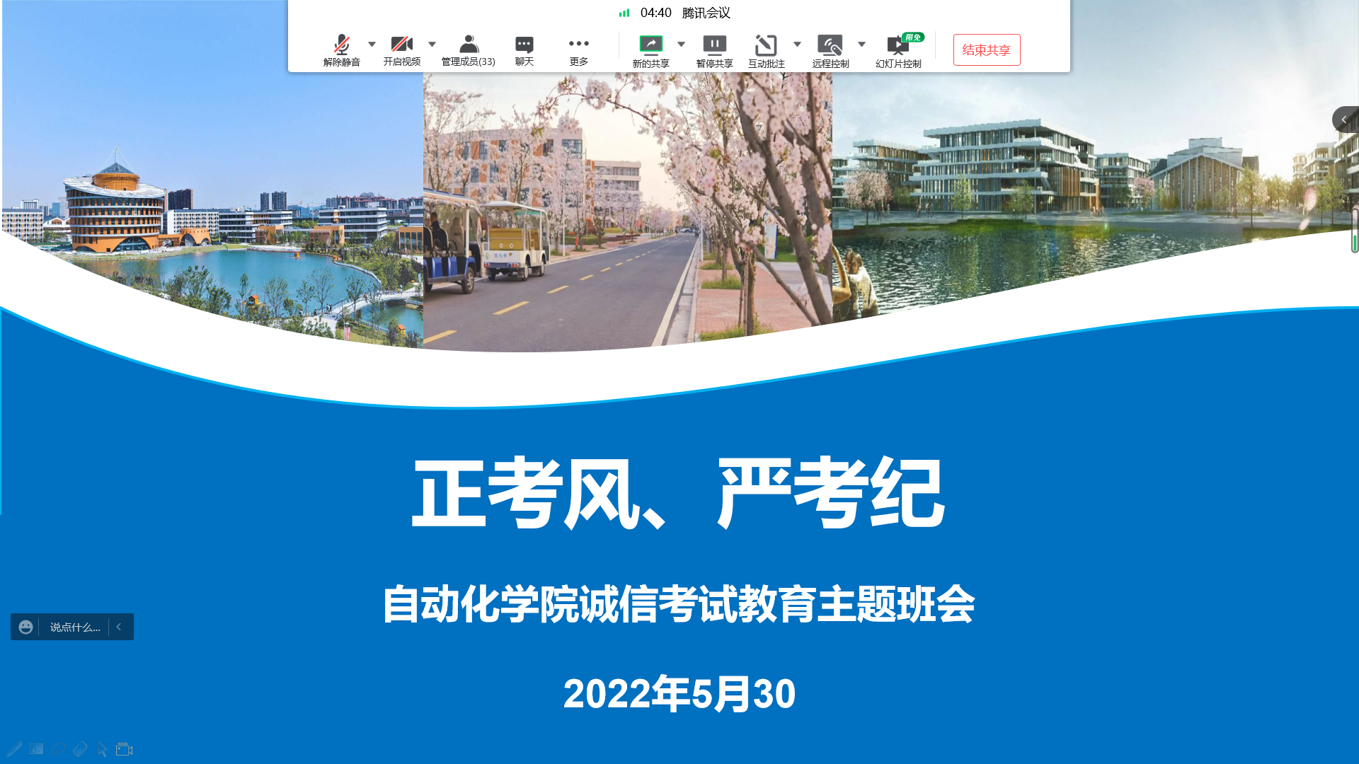 期末考试临近,为正考风、严考纪,进一步加强自动化学院学子诚信教育,5月30日,学院开展诚信考试教育主题活动。本次活动分为线上主题班会和线下宿舍走访两部分,由左飞飞老师主持。