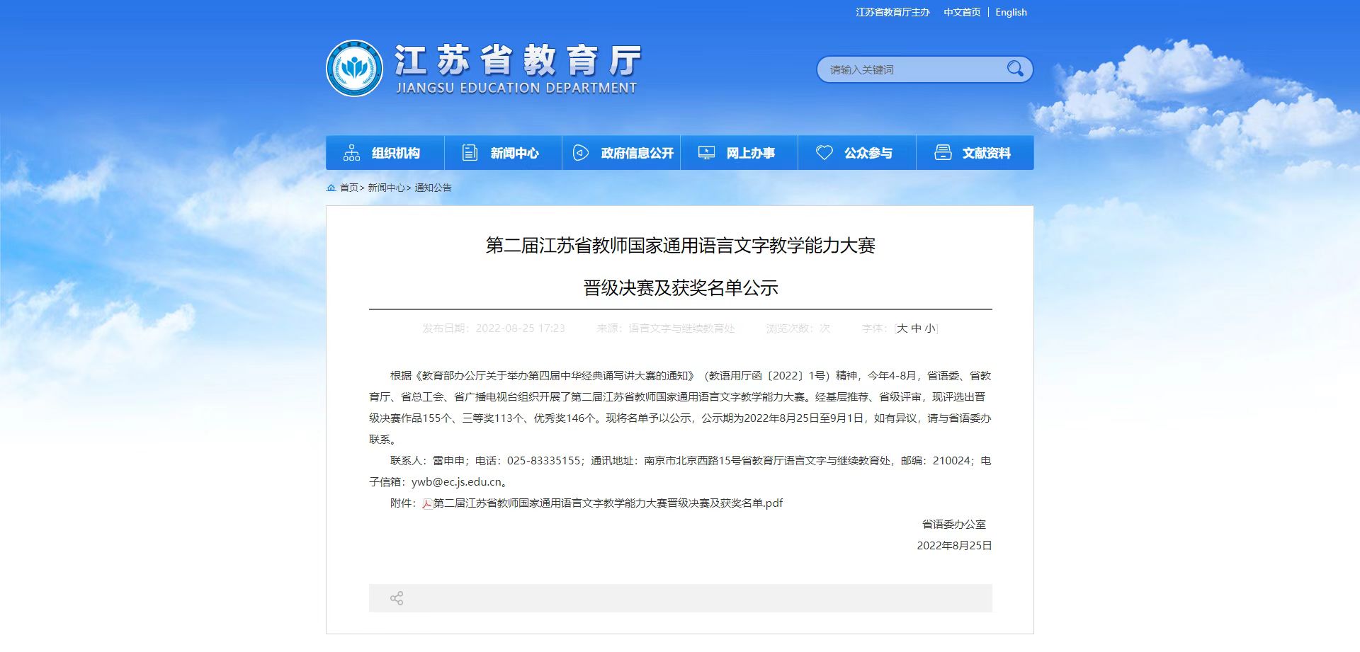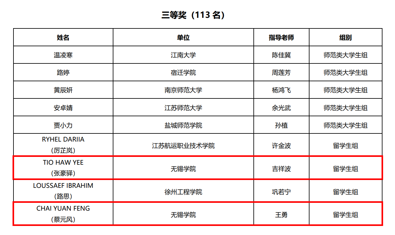 近日,由江苏省教育厅、江苏省语言文字工作委员会、江苏省总工会和江苏省广播电视总台联合举办的“第二届江苏省教师国家通用语言文字教学能力大赛”评选结果揭晓,我校马来西亚籍留学生CHAI YUAN FENG(蔡元风)和TIO HAW YEE(张豪驿)喜获留学生组三等奖。