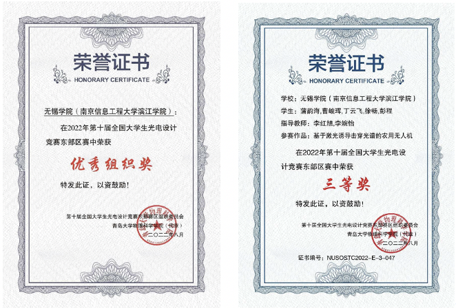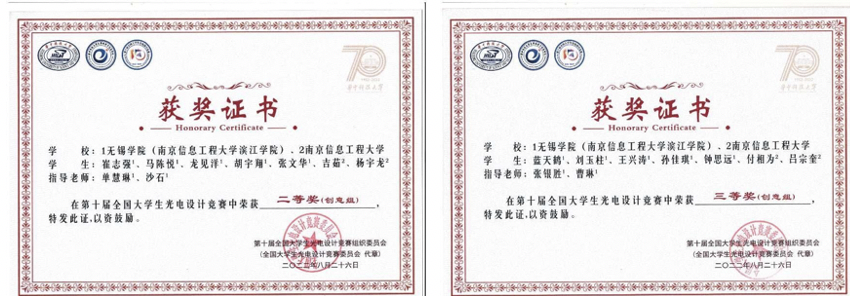 在4月下旬,为筹备我校首次参加光电设计竞赛的工作,承办单位——电子信息工程学院通过竞赛实验班的形式,开展了竞赛相关的选拔和培训工作。在7月中旬举行的东部赛区竞赛中,我校共有学生74人、13支队伍参赛,其中3支队伍获得东部赛区一等奖,并晋级国赛,7支队伍获得三等奖,获奖率77%,无锡学院获得“优秀组织奖”。经过前期华北、东北、西北、西南、中部、东南和东部七个分赛区选拔,最终有来自154所高校的337个支参赛队进入全国赛。最后,在8月中旬的全国总决赛中,我校1支队伍获得二等奖,2支队伍获得三等奖。