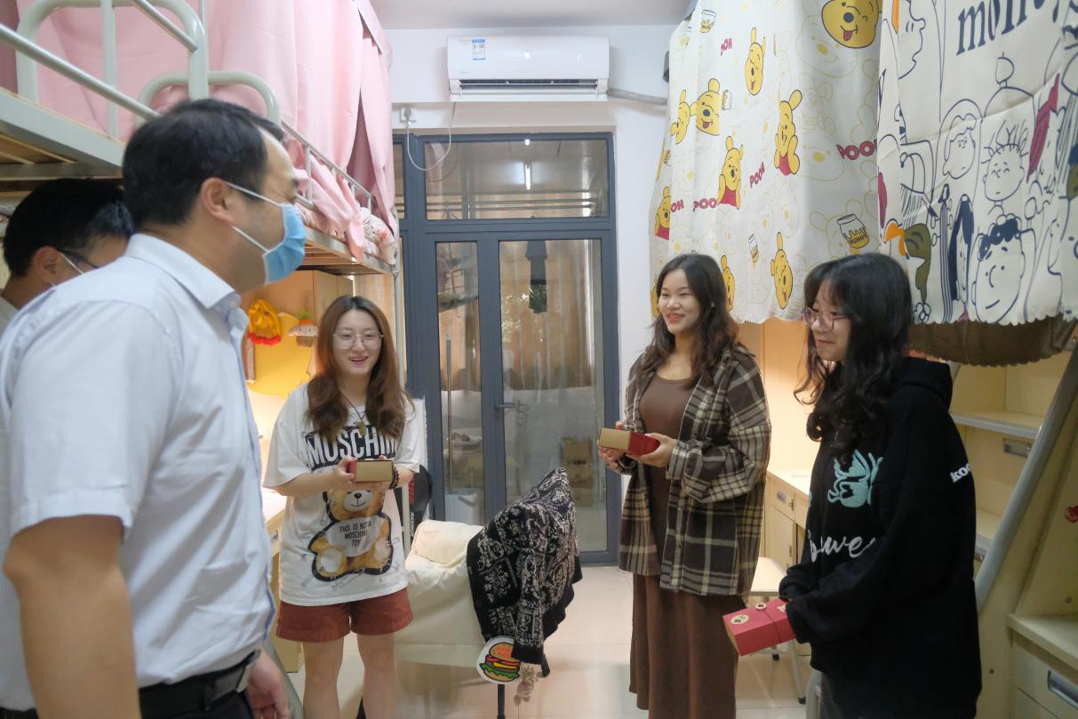 交谈过后,李步浩和辅导员老师们将定制月饼送到同学们手上,传递了浓浓师生情意。