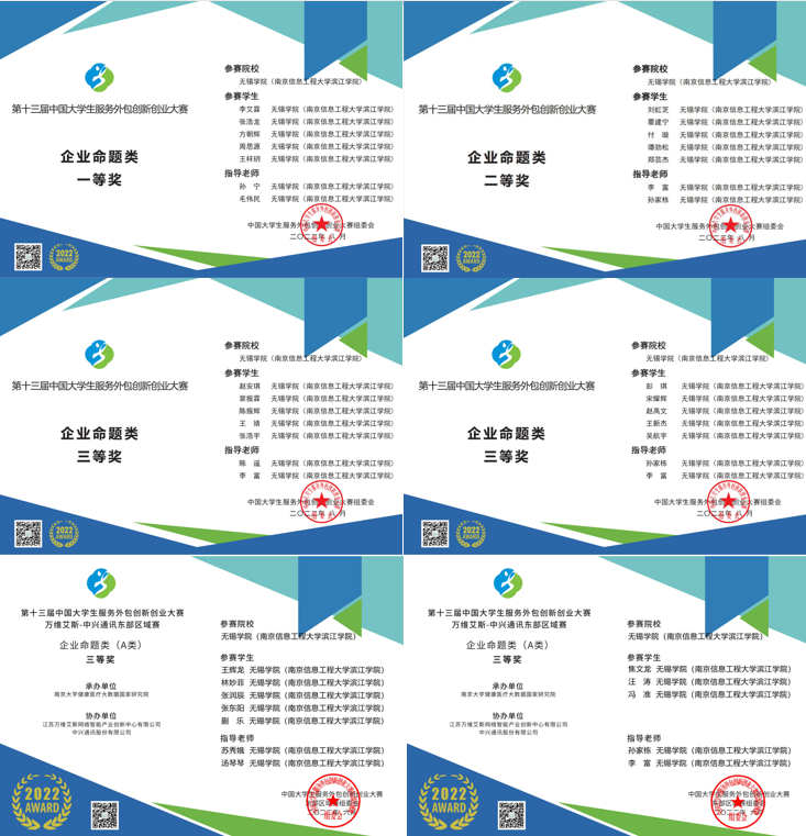 由孙宁和毛伟民两位老师指导的“一键get0DAY”团队以作品“基于UBSIP实现计算机云外设软件”获得全国总决赛一等奖;由李富和孙家栋两位老师指导的“横眉冷队”团队以作品“智能安全驾驶监测系统”获得全国总决赛二等奖;由陈遥老师指导的“DTG”、“nice冲冲冲”团队以作品“智能云电子警察系统”获得全国总决赛三等奖;另外,由苏秀娥和汤琴琴两位老师指导的“无锡NT“和“外包一小队”也获得了华东赛区三等奖的好成绩。