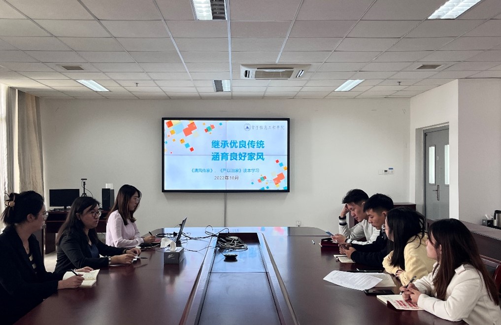 以“谈”倡廉。10月10日,电信院教师党支部积极开展关于家风建设读本《清风传家》《严以治家》专题研讨学习会,深入学习英模党员在家风建设方面先进事迹,引导党员干部树立严以修身的意识和从严治家的理念,争作家风建设的表率。