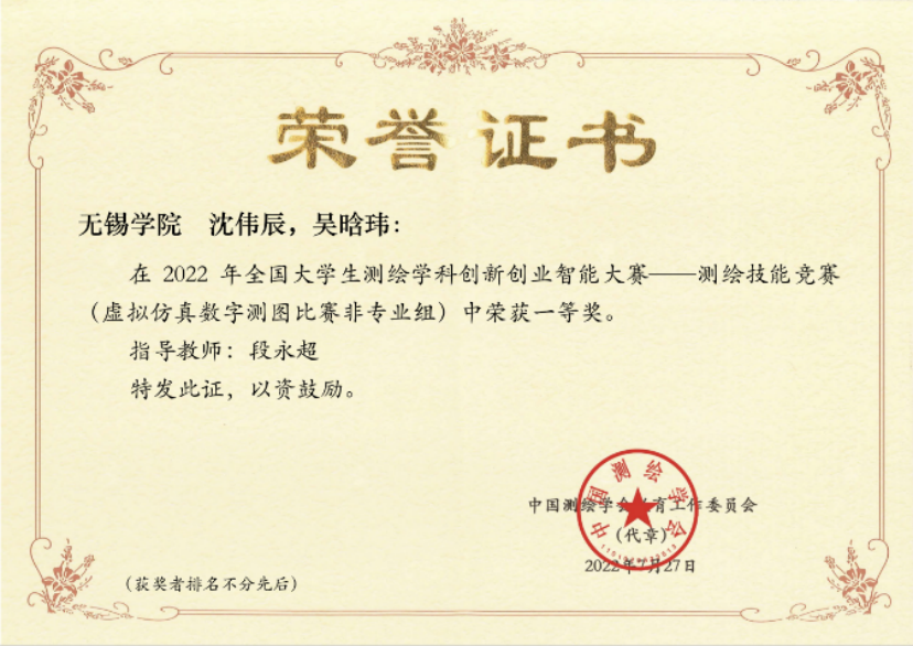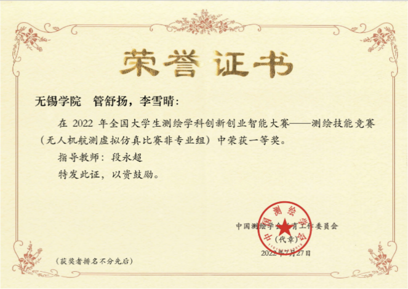 7月22日,2022年全国高等学校大学生测绘技能大赛在主办地安徽大学落下帷幕。本次系列竞赛我校学子共获得国家级一等奖4项、二等奖4项的好成绩。其中,由我校大气与遥感学院(以下简称“大遥院”)周晨虹、段永超老师负责指导的宋链极,管舒扬,李雪晴等10组同学获得虚拟仿真数字测图赛项一等奖2项、二等奖2项;无人机航测虚拟仿真大赛赛项一等奖1项;测绘程序设计赛项二等奖1项;科技论文一等奖1项,获奖情况连年创新高。