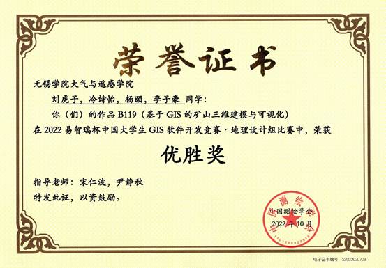 近日,2022易智瑞杯中国大学生GIS软件开发竞赛(简称“GIS开发竞赛”)落下帷幕,大气与遥感学院4支队伍在竞赛中脱颖而出,荣获奖项。学院夏雯昕、韦郭屹奕、庄家富、杨珺同学的作品《失落的MU5335-GIS视角下的行动轨迹》被评为地图故事组三等奖;陈鑫海、李家乐、黄兆晖等同学的作品《GIS“一张图”技术在雷电灾害风险区划中的应用》被评为地理设计组优胜奖;刘虎子、冷诗怡、杨颐、李子豪同学的作品《基于GIS的矿山三维建模与可视化》被评为地理设计组优胜奖;彭晨、黄秋璨、张译方同学的作品《基于GIS的丹江口水库库容演算模拟研究与可视化》被评为地理设计组优胜奖。