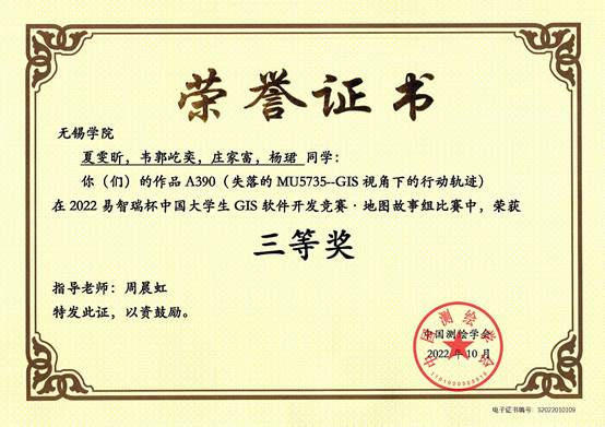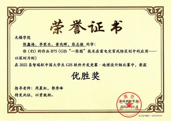 GIS开发竞赛是由中国测绘学会主办,易智瑞信息技术有限公司承办的一项国家级专业性竞赛。其目的在于推动GIS技术在中国的普及,并为GIS产业的发展选拔和储备大量优秀人才。自2004年起,该竞赛已成功举办十九届,每年都成为极富影响力和备受瞩目的一项赛事。本届竞赛,共收到来自包括武汉大学,北京师范大学,南京师范大学,中山大学等超200所高校和5000多名师生参赛,其中地图故事组共566个作品、地理设计组作品共337个作品,我院学生作品最终凭借扎实的基础和巧妙的创意在众多高校作品中脱颖而出,荣获三等奖1项和优胜奖3项。