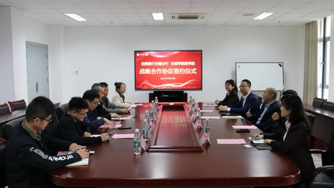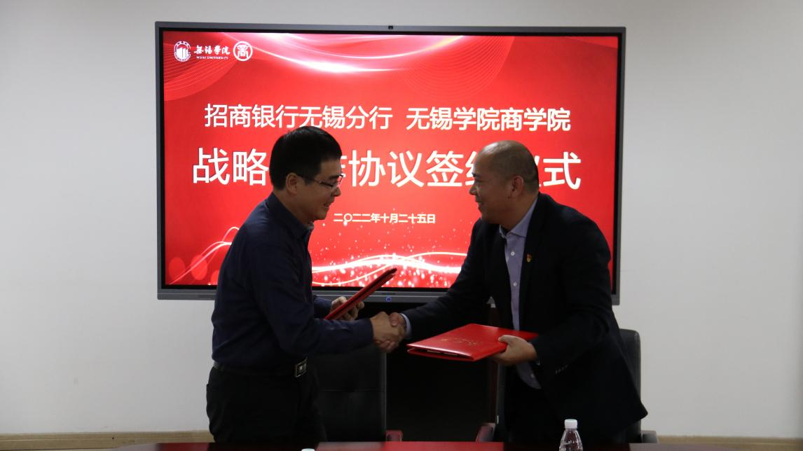 10月26日下午,商学院与招商银行无锡分行在尚美楼签订战略合作协议。招商银行无锡分行零售金融事业部常务副总裁陆明宇、人力资源部副总经理徐鑫等,商学院负责人刘军、党总支负责人孙振、金融与贸易系系主任高志文、分团委书记李诗雅等,参加本次签约仪式。签约仪式由孙振主持。