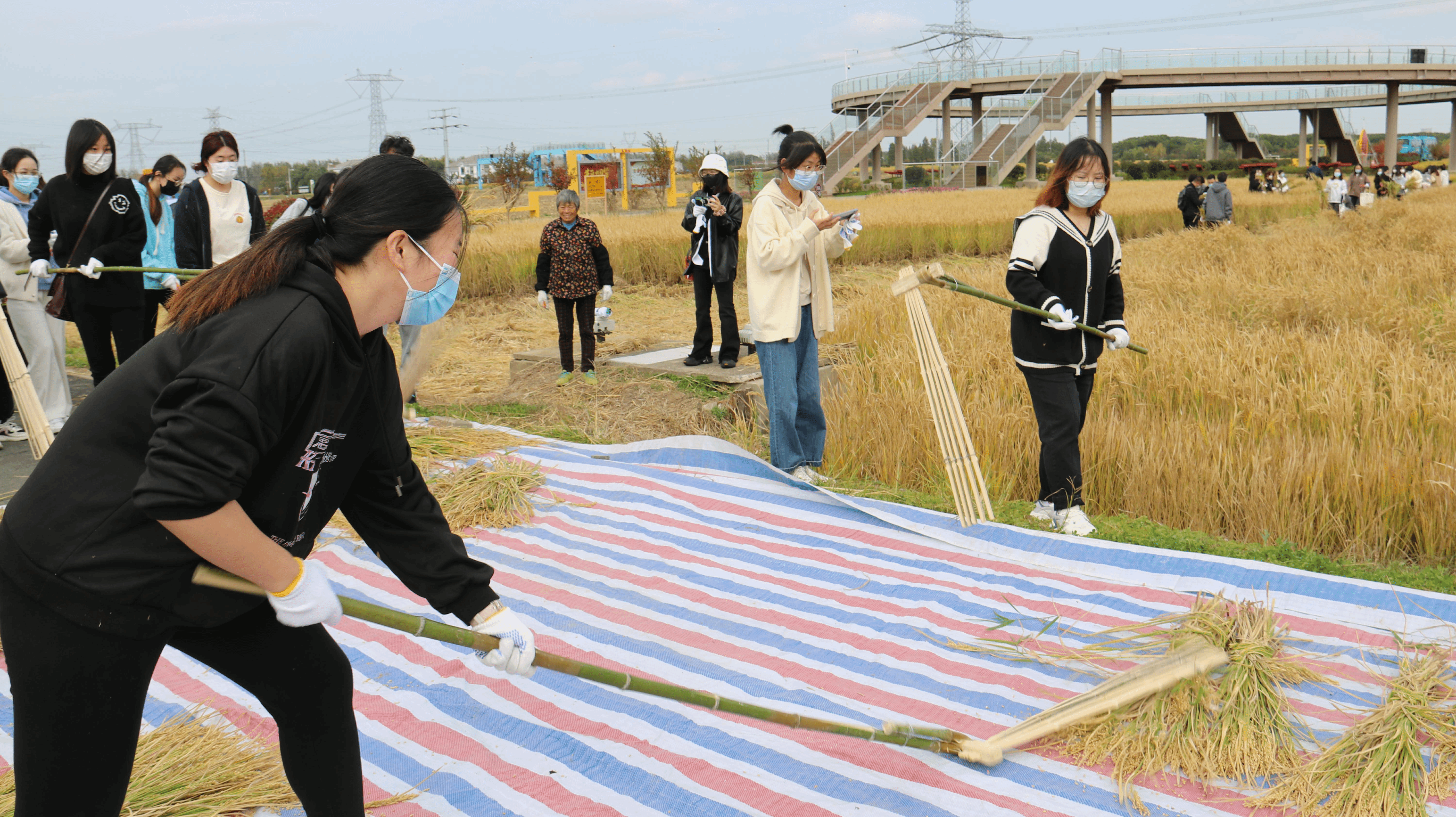 来到锡山国家现代农业产业园内的太湖水稻示范园,通过讲解员的讲解,大家了解到了江南传统农业、无锡现代农业、世界先进农业和我国的农业农村的相关政策政策以及特色水稻的相关知识。随后,示范园工作人员向大家讲解了安全防护要点和水稻收割与捆扎技术要领,并在他们的亲自演示和悉心指导下,师生们纷纷拿起镰刀、手套等物资,踩进泥土、弯下腰,认真割稻并整理。辛劳过后,师生们相互协作,在田间大灶台周围,锅铲交响、柴火添香,品尝着耕种的辛苦和收获的喜悦。