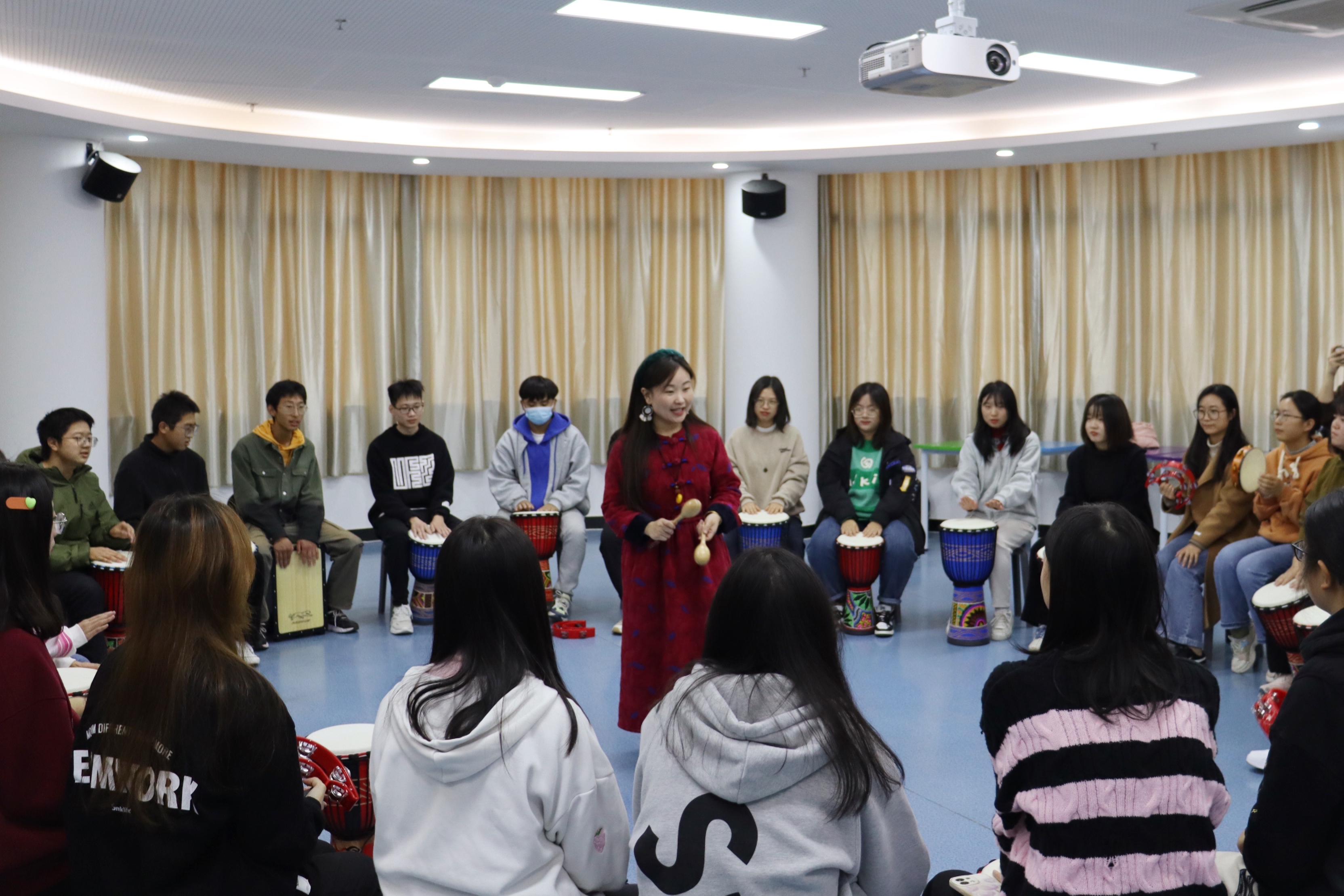 活动开始,心理健康教育中心吴安莲老师介绍了鼓圈的发源及其作用机制和宗旨原则,并宣读团体契约,创设了安全、尊重、信任的团队氛围。随后通过热身操,使同学们彼此之间建立初步连接。在之后的活动中,大家用音乐、鼓点、节奏对话,充分利用自己的肢体和乐器,通过不同的拍打方式和节奏,共同合奏出美妙的青春之歌。在最后的分享环节,同学们纷纷表示在活动中受益匪浅。