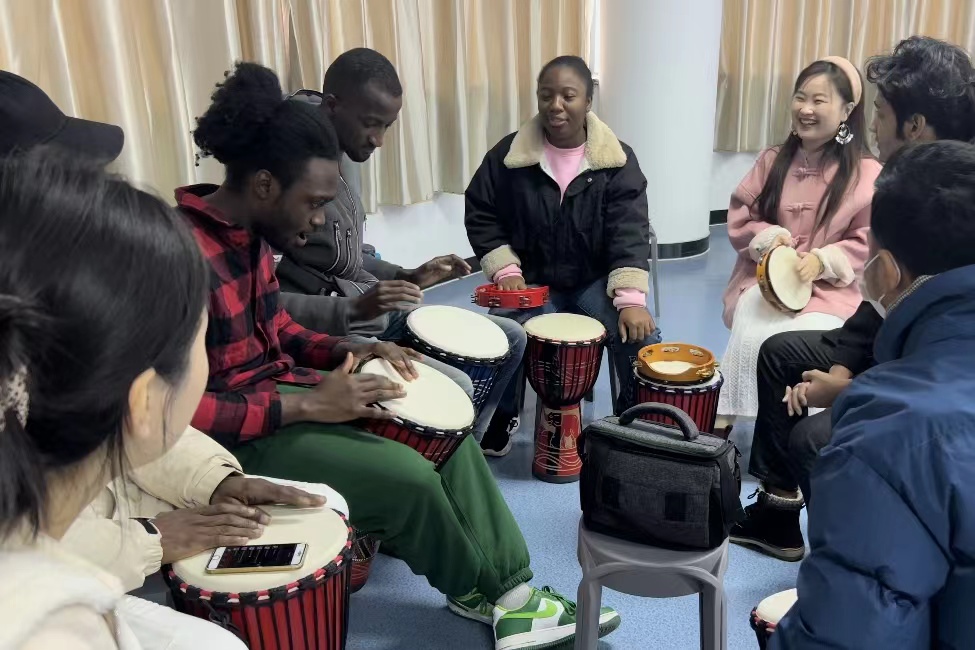 讲座现场,学生工作处吴安莲老师针对留学生群体特征,从心理健康的基本知识、留学生常见心理问题、症状表现与成因以及如何应对等方面展开,引导留学生正确认识自身心理变化,保持乐观向上的生活态度,增强面对心理困惑时的自我调节能力,并在发现自己出现相关症状时积极调整、及时寻求帮助。讲座最后,吴老师带领大家进行了一场鼓圈团体减压活动,在宣泄情绪、释放压力的同时,加强了留学生之间的相互了解与沟通合作能力。