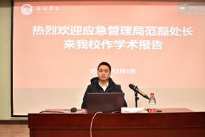 12月3日下午,无锡市应急管理局安全生产基础处处长范磊应邀访问无锡学院,并在行政楼227会议室作了“工业企业安全生产形势和现状”的主题学术报告。报告由大气与遥感学院负责人刁一伟主持,朱红霞、郭秀峰、梅卫群、蔡鹏等教师及大气与遥感学院同学参加。