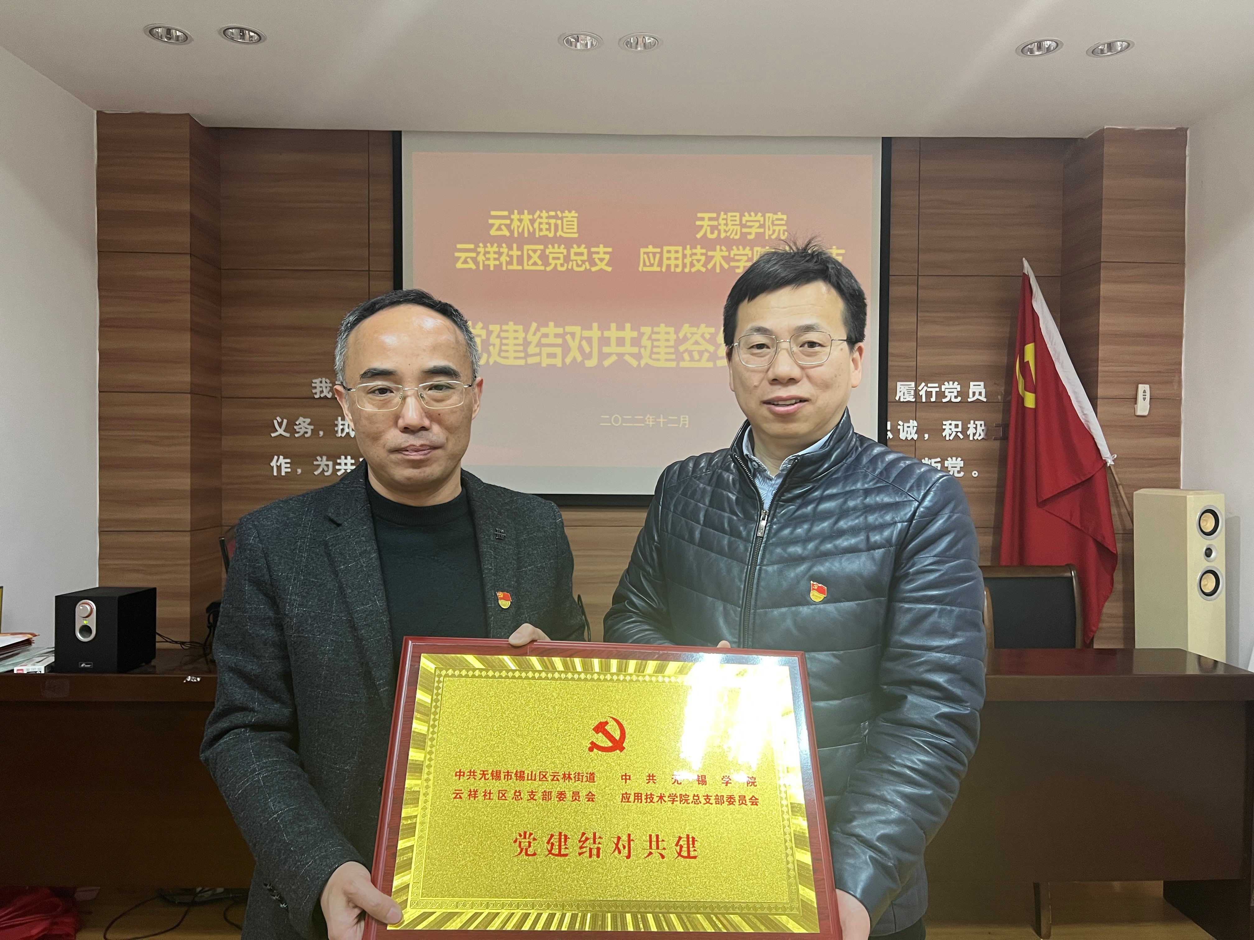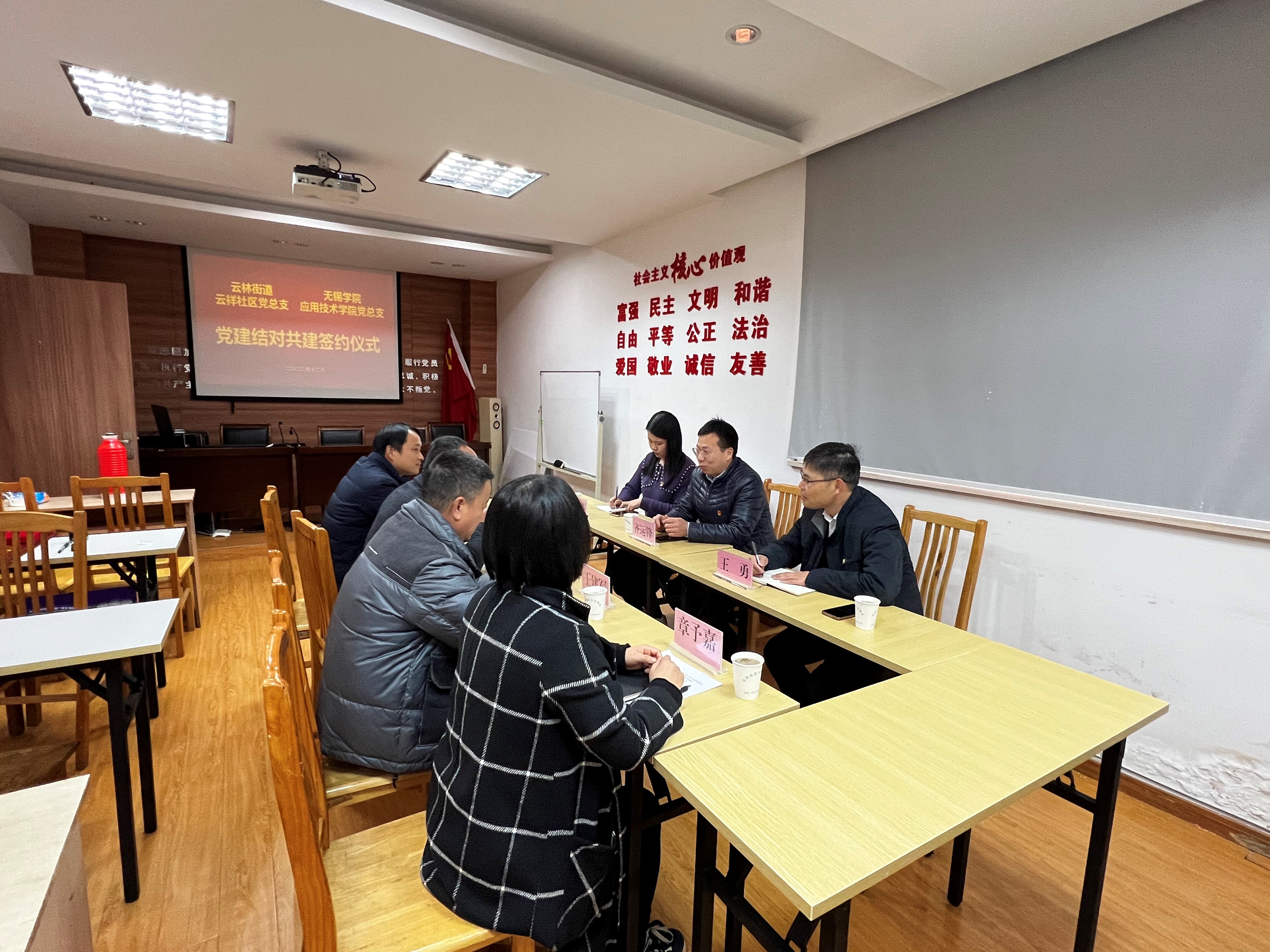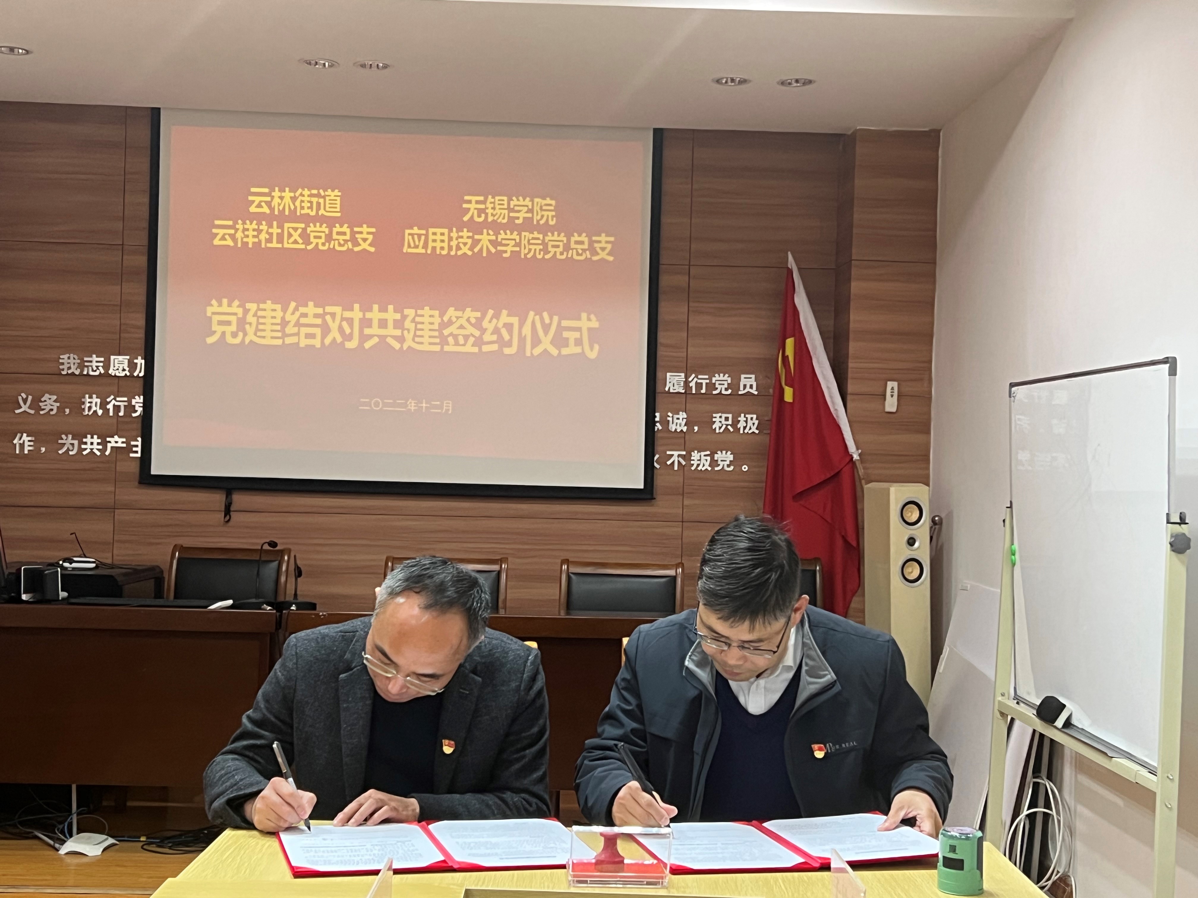 12月1日下午,应用技术学院党总支与云林街道云祥社区党总支在云林街道云祥社区举行党建结对共建签约仪式。云林街道云祥社区党总支书记徐军,常务副书记王建军,党总支副书记章予嘉,社区副主任陆建冬,应用技术学院负责人齐运锋、党总支负责人王勇出席活动。