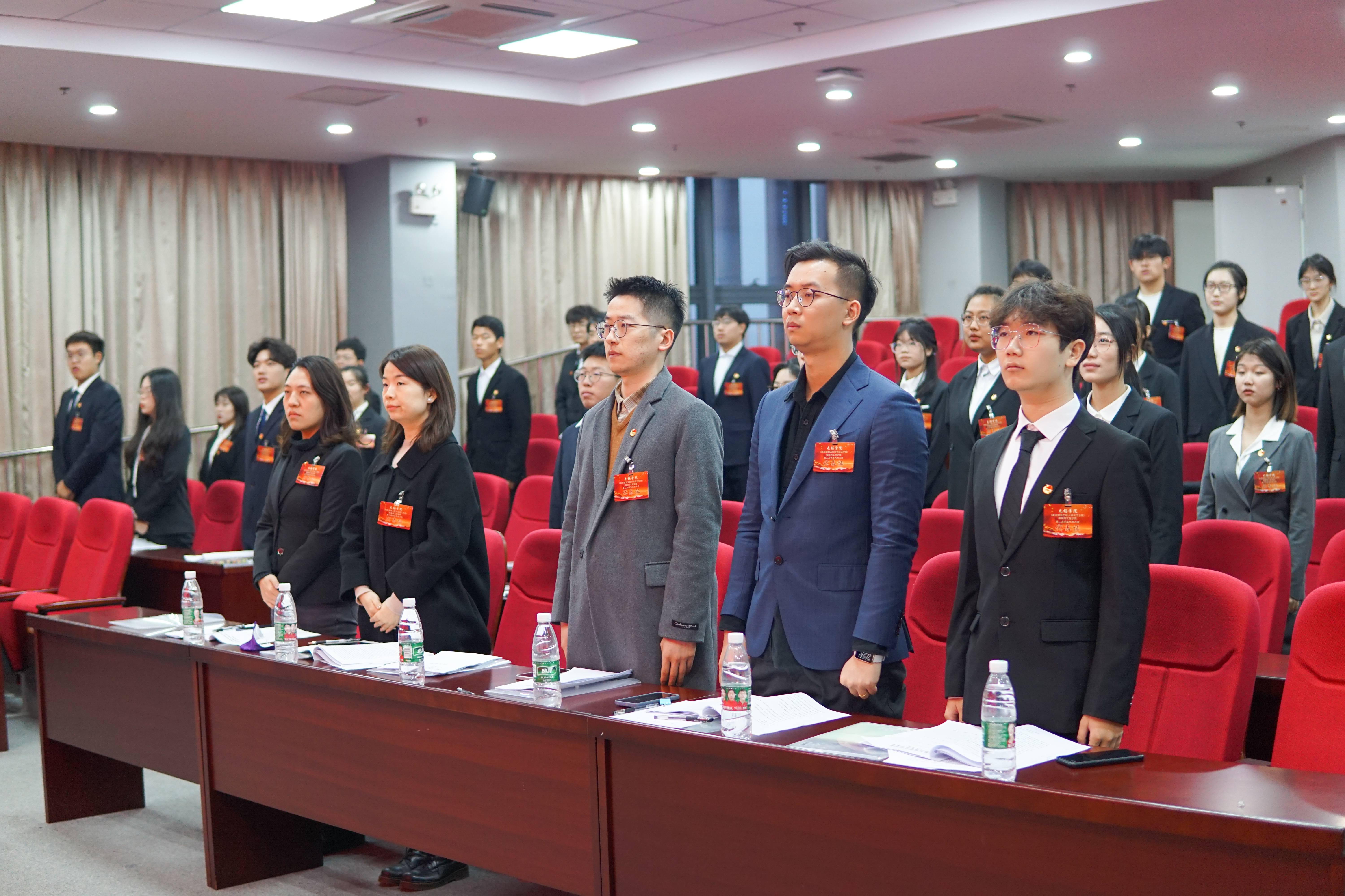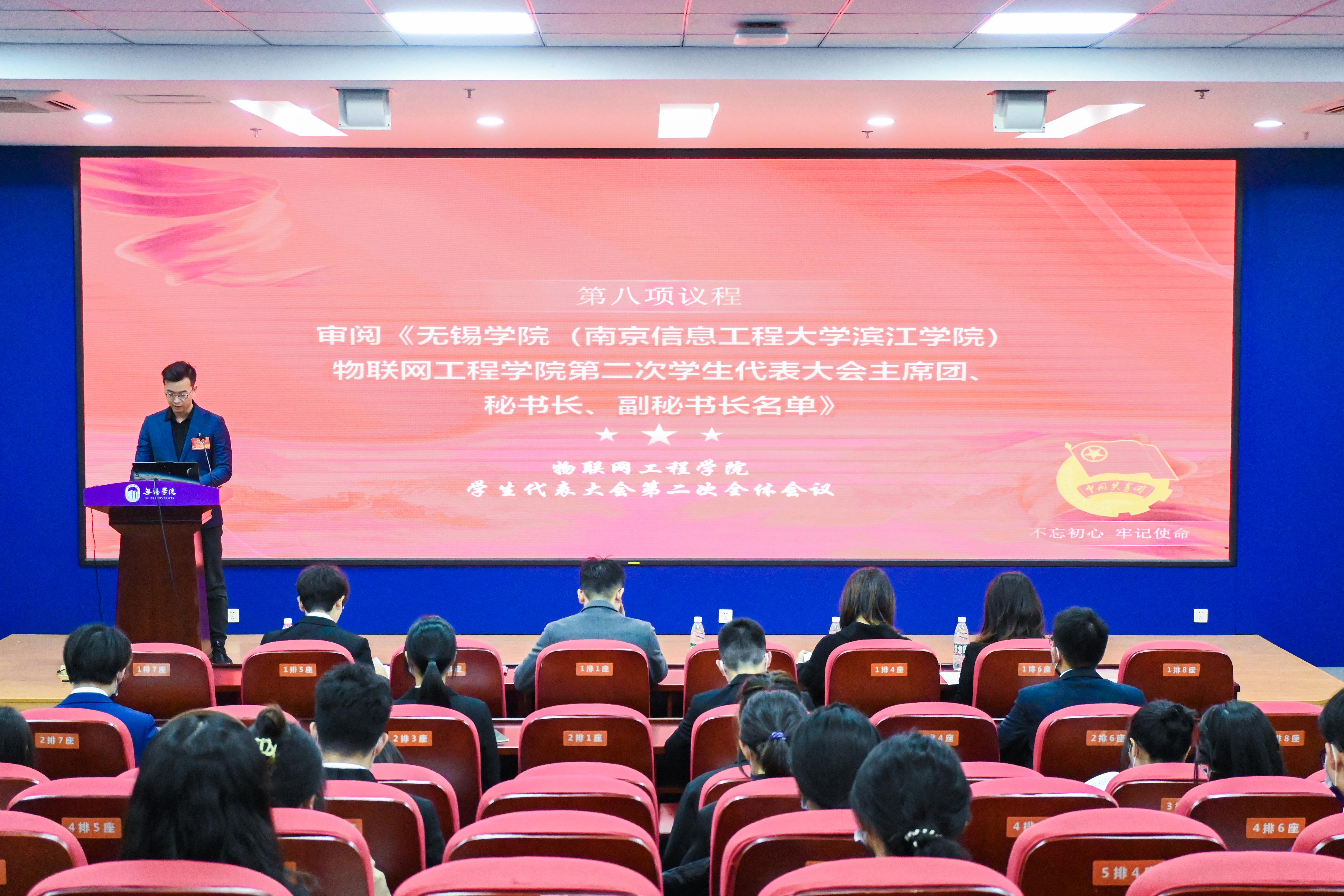 下午16时,会议在雄壮的国歌声中隆重开幕。大会首先由校学生会主席团成员田文韬致开幕贺词。随后,物联网工程学院孙昊老师作物联网工程学院学生会工作报告,报告全面回顾和总结了一年来物联网工程学院的学生工作,并提出了今后的工作目标和主要任务。大会审议通过了《无锡学院(南京信息工程大学滨江学院)物联网工程学院第二次学生代表大会筹备工作报告》和《无锡学院(南京信息工程大学滨江学院)物联网工程学院第二次学生代表大会代表资格审查报告》。大会还表决通过了《无锡学院(南京信息工程大学滨江学院)物联网工程学院第二次学生代表大会选举办法》,以无记名投票方式差额选举出物联网工程学院第二届主席团成员。选举结束后,物联网工程学院周亦姗老师宣读《无锡学院(南京信息工程大学滨江学院)物联网工程学院第二次学生代表大会提案工作报告》,新一届主席团成员邓建华宣读大会倡议书。在顺利完成各项议程后,大会在团歌声中圆满落下帷幕。