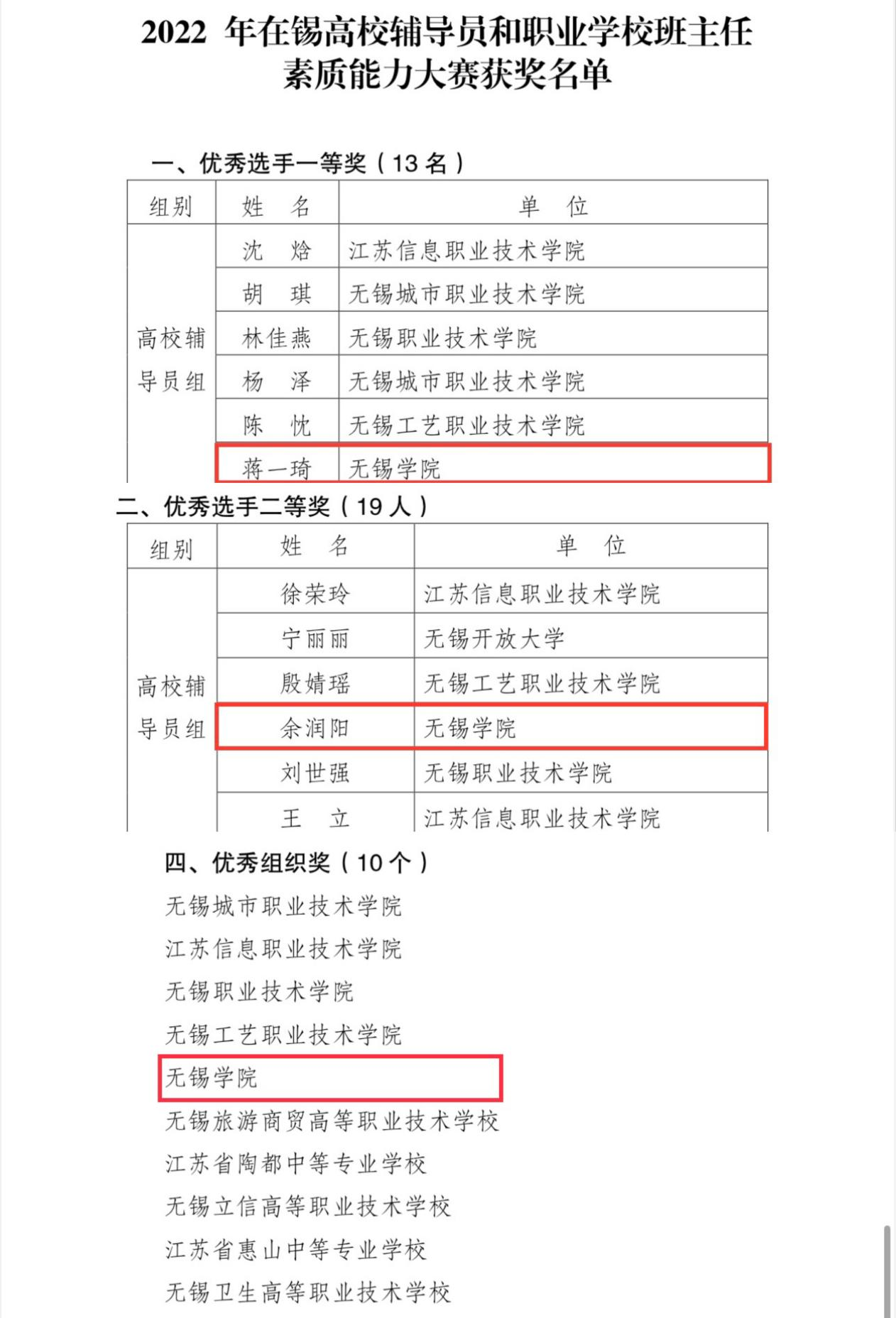 近日,第二届在锡高校辅导员素质能力比赛决赛结果揭晓,我校喜获佳绩,参赛辅导员荣获一等奖、二等奖各一项,我校获优秀组织奖。
