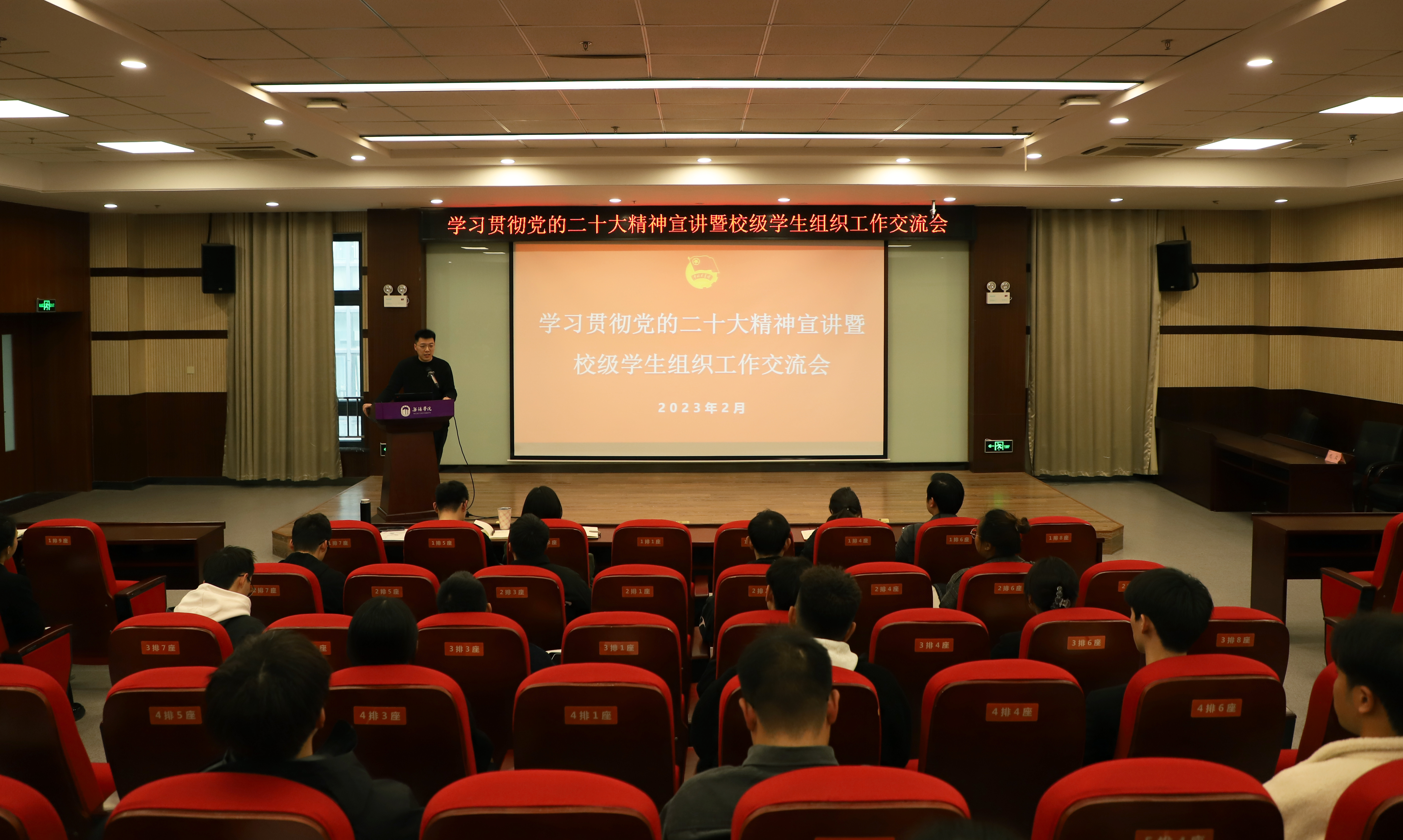 为深入学习宣传贯彻党的二十大精神,扎实推进团学组织各项工作顺利开展,2月21日下午,校团委组织召开学习贯彻党的二十大精神宣讲暨校级学生组织工作交流会。校团委书记李沛武、校团委全体工作人员和校级学生组织负责人参会。会议由校团委翟明东老师主持。