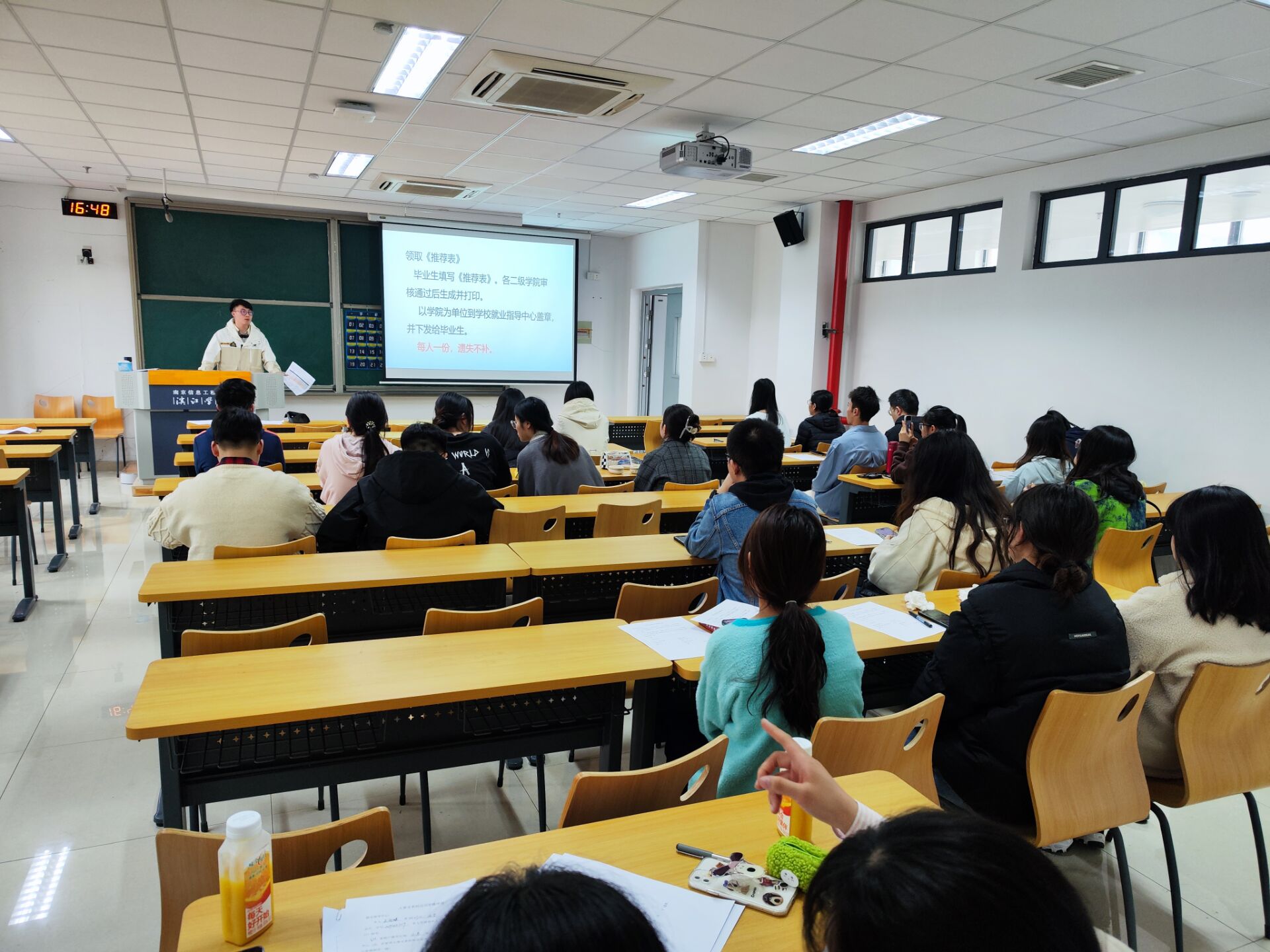 会议最后,毕业班辅导员董磊详细讲解了毕业生就业流程,就三方协议和劳动合同的签订、毕业生档案的转寄、五险一金的缴纳等同学们热切关注的问题作了解答。