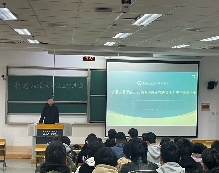 为深入推进轨道交通学院2023届学生考研就业进程,3月23日,轨道交通学院于尚美楼205教室开展考研复试就业动员暨学期安全教育大会。学院党总支书记朱广革,副院长朱菊香,分团委书记段芮,班主任汤琴琴及教师代表仇维斌,学院教学秘书卫威,各年级辅导员参加本次会议。会议由辅导员李佳熙主持。