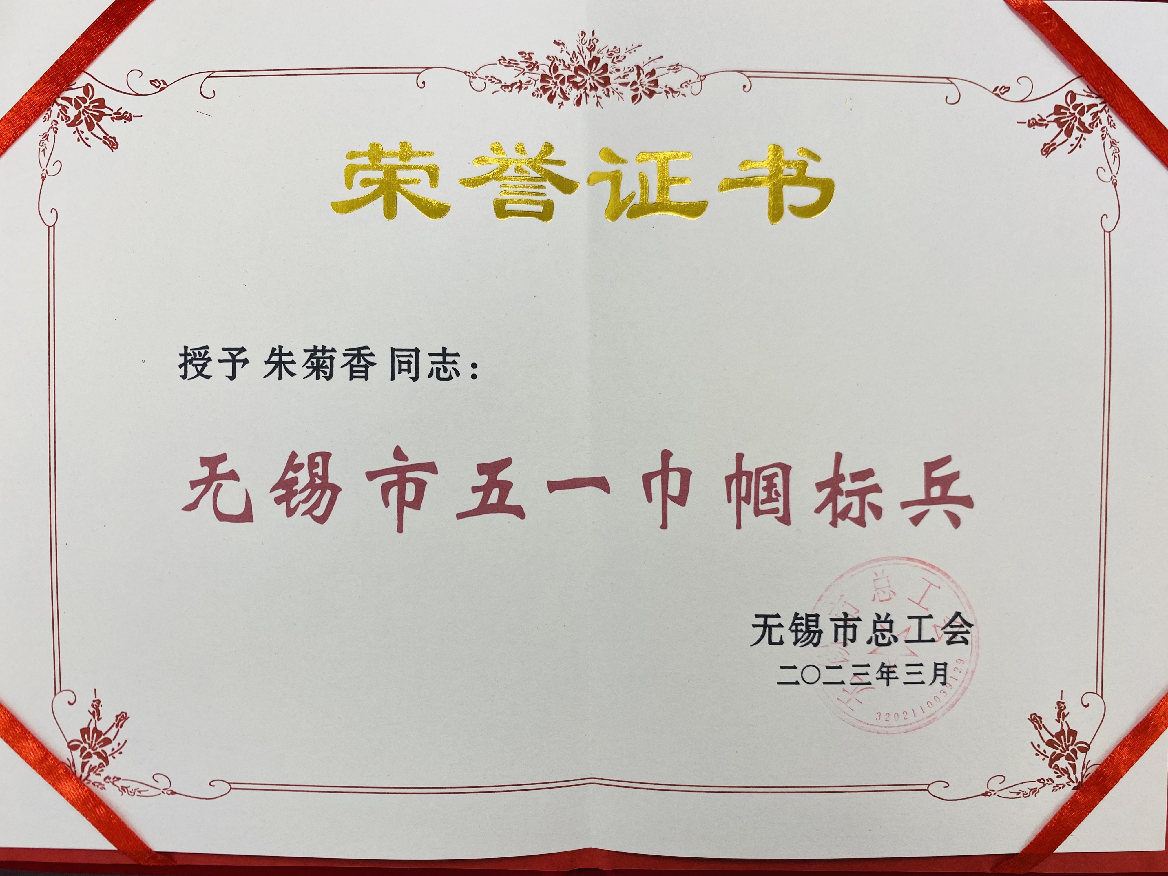 为全面贯彻落实党的二十大精神,在全市女职工中大力弘扬劳模精神、劳动精神、工匠精神,激励广大女职工为全面推进中国式现代化无锡新实践贡献力量。近日,无锡市总工会公布了2023年度无锡市先进女职工集体和个人,我校朱菊香同志荣获“无锡市五一巾帼标兵”荣誉称号。