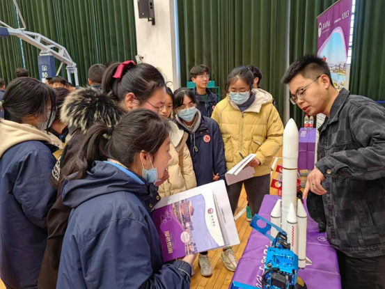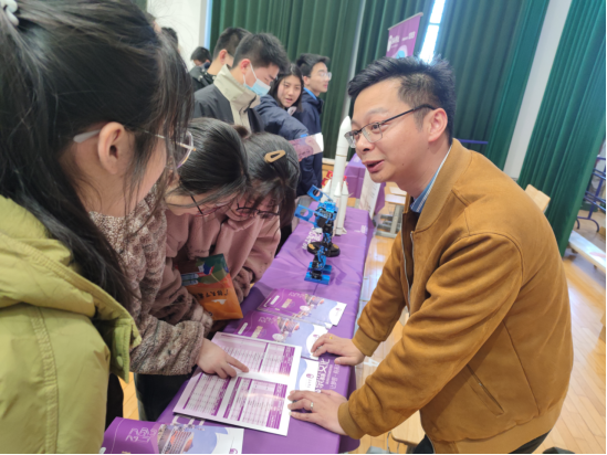 8日上午,陈凯峰一行前往江苏省东台中学体育馆开展生涯嘉年华活动,活动现场,学生与家长们兴致勃勃观看了我校自动化机器人、北斗导航卫星、中国航天运载火箭等宣传展品和东台籍优秀毕业生展板与宣传册。陈凯峰向同学们介绍了我校发展前景、办学特色和招生政策,并鼓励同学们好好学习报考我校。张国宇为同学们科普讲解自动化机器人的运行原理以及北斗导航卫星的发展历程与相关专业联系,帮助学生感知高校和高校专业,进一步明晰专业定位从而选择心仪大学。