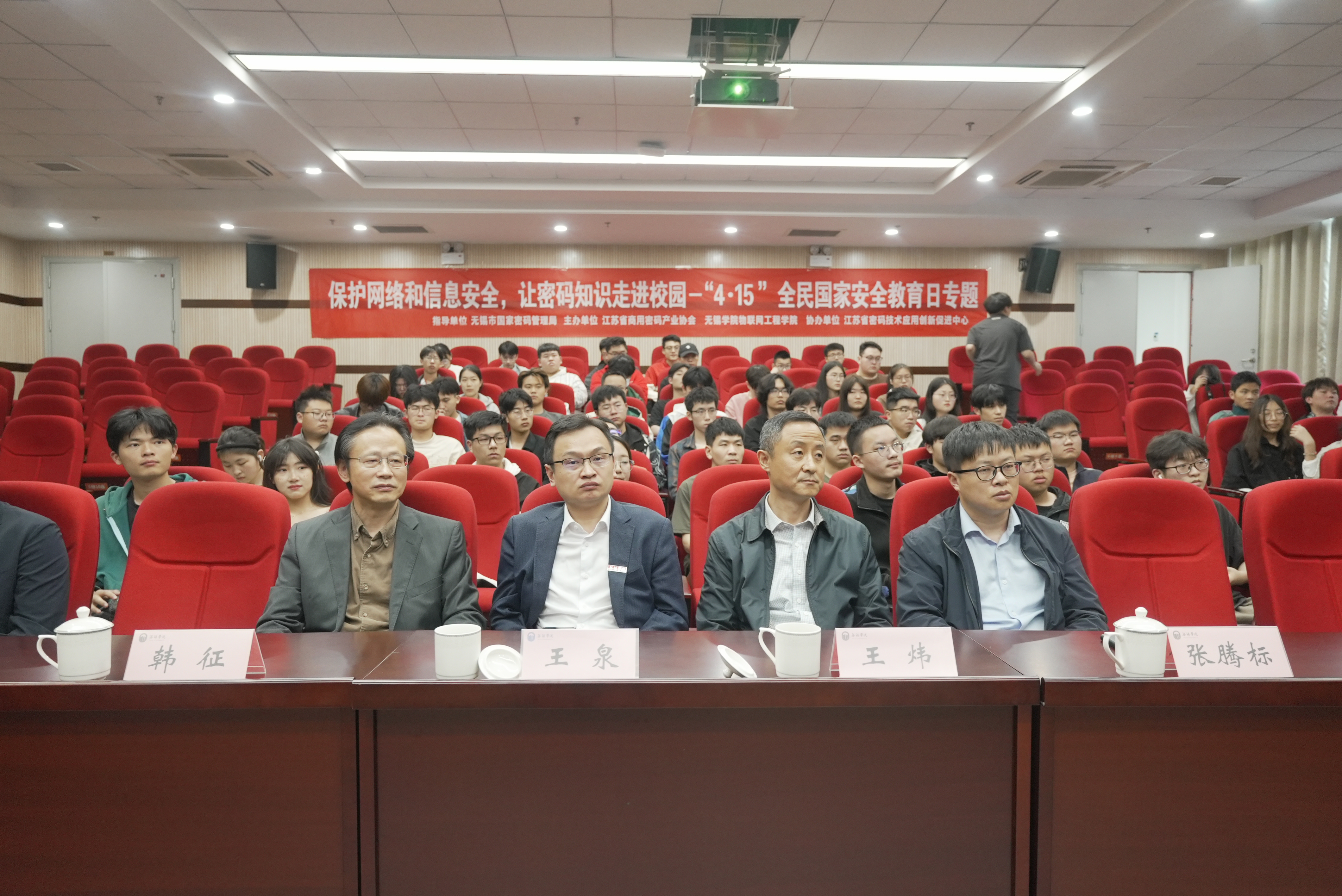 2023年4月15日,是第八个全民安全教育日,主题为“贯彻总体国家安全观,增强全民国家安全意识和素养,夯实以新安全格局保障新发展格局的社会基础”。在无锡市国家密码管理局的指导下,江苏省商用密码产业协会联合物联网工程学院共同举办“密码安全进校园”活动,无锡市国家密码管理局处长王炜,江苏省信息安全测评中心网安中心主任张腾标,江苏意源科技有限公司副总经理韩征,江苏省密码技术应用创新促进中心网安部主任张翀,物联网工程学院院长王泉,党总支副书记臧文佳出席本次活动,物联网工程学院百余师生参加本次活动。活动由臧文佳主持。