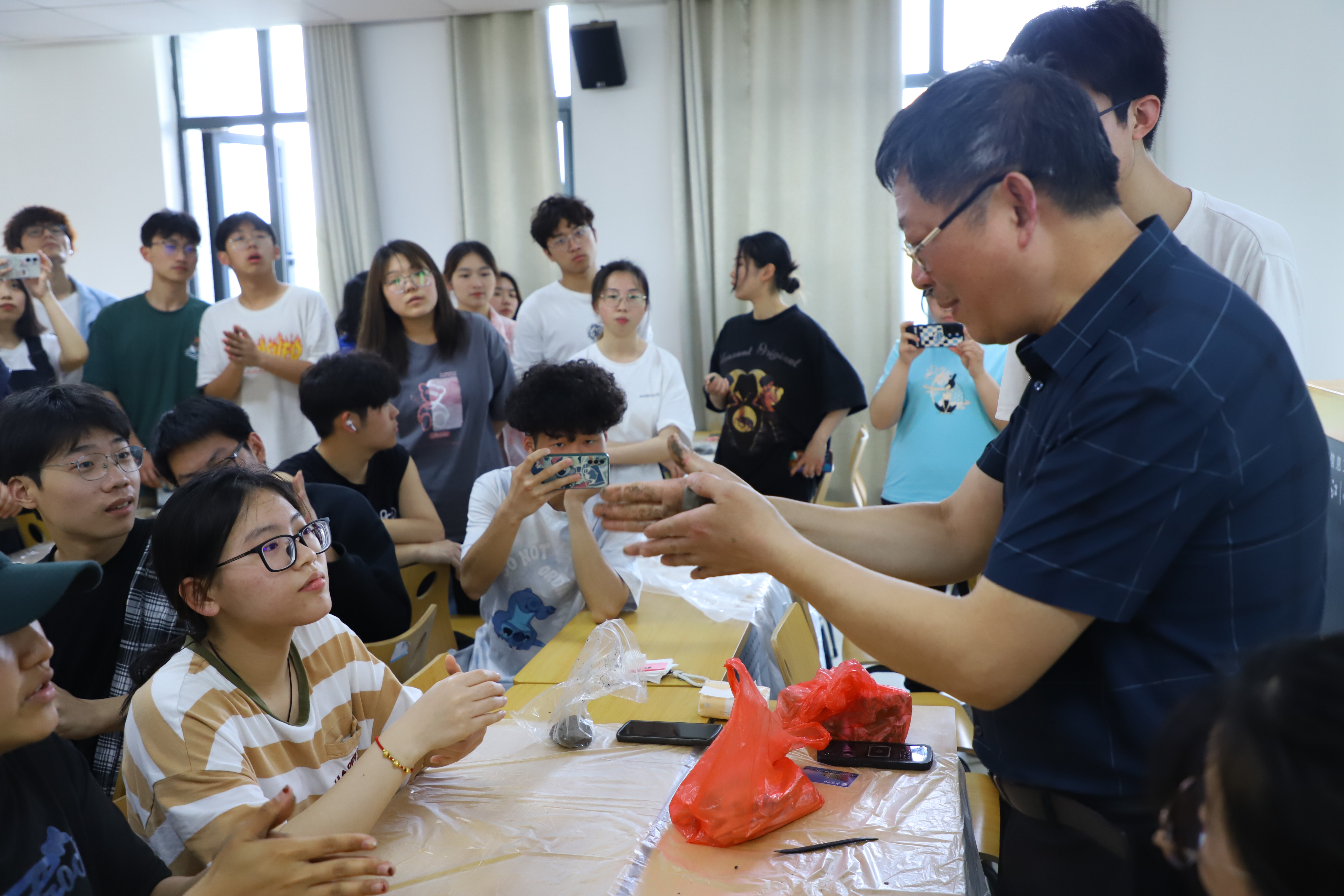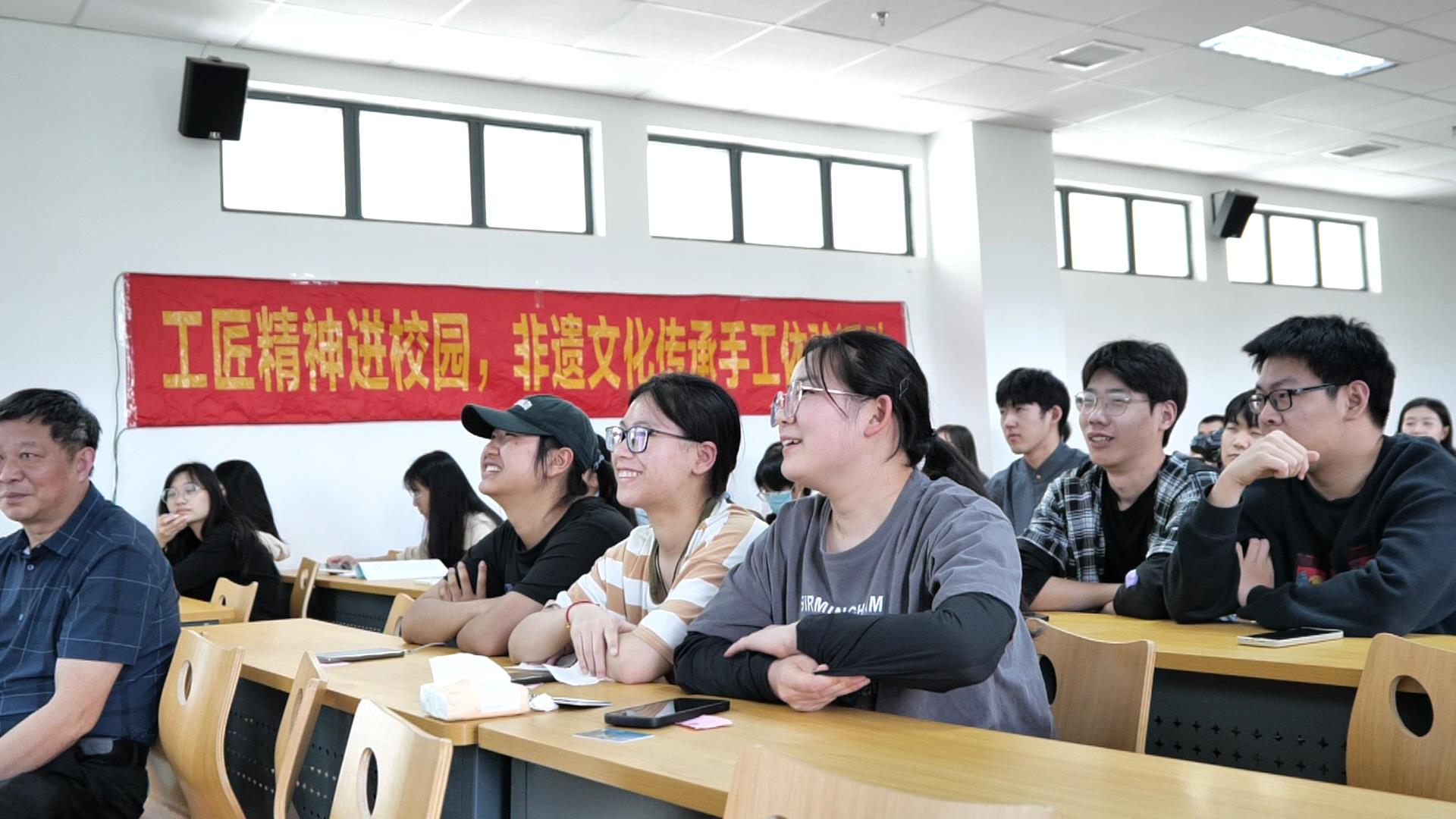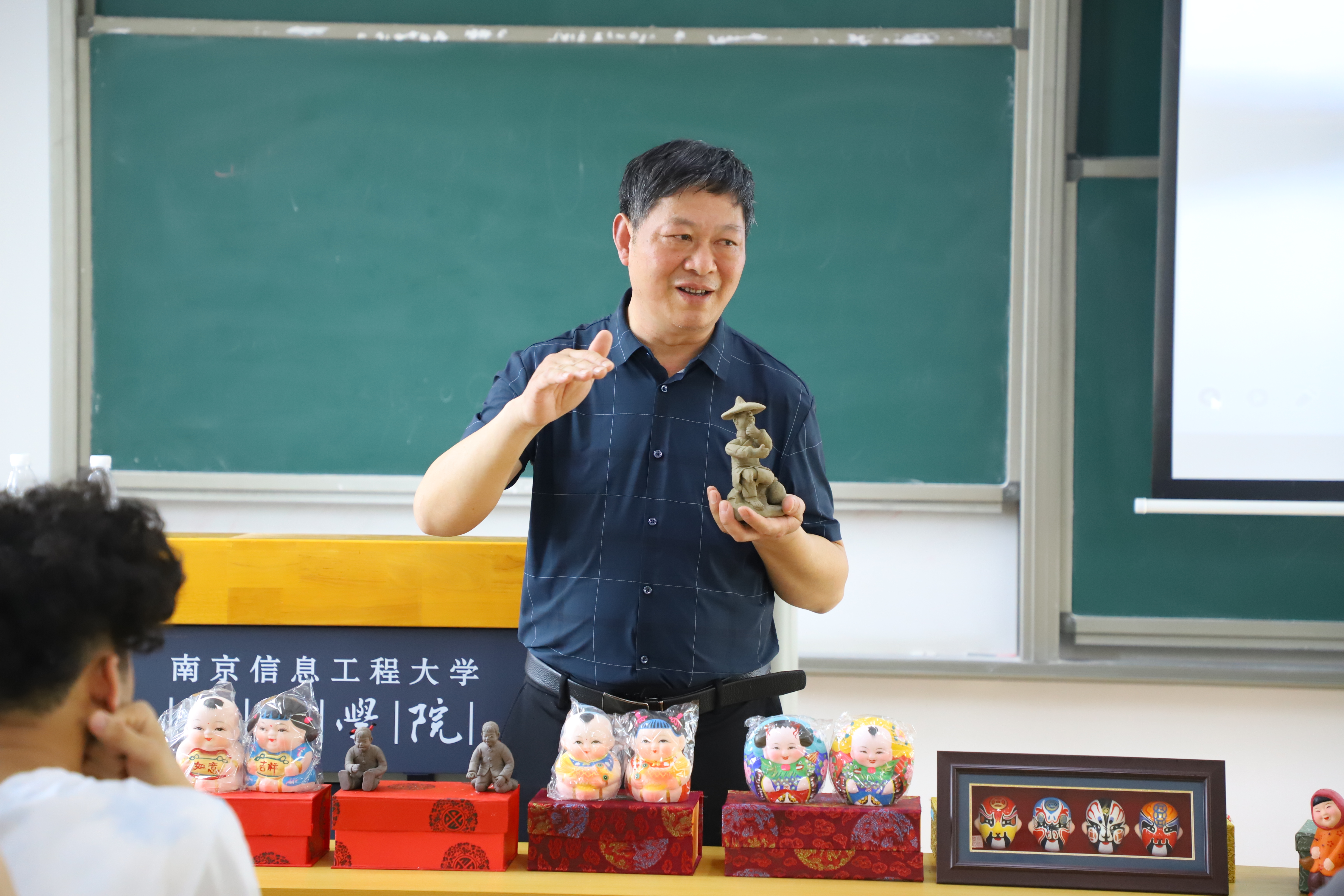 徐海云围绕惠山泥人的历史渊源和造型由来等方面为同学们开展了生动活泼的讲座,并组织了现场问答。同学们抢答热烈,现场热情高涨。吴国登为同学们详细讲解了惠山泥人非物质文化遗产的分类及其传承精神,并现场展示“小兔子”造型的捏法。在吴老师的带领下,同学们自行分组并尝试自己动手制作泥人,捏出自己心仪的各类卡通图案、动物图案,增进了对泥人行业的了解。