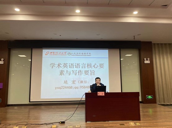 延宏副教授针对国际期刊论文写作中的学术语言使用特点与规范,用翔实的句例分析学术英语名词化的实现方式,探析被动语态在学术英语中的使用原因与应用语境,介绍非谓语动词短语在学术英语中的语法功能与使用规范等内容,并对其特点和规律进行总结。此次报告在与会师生中反响强烈。