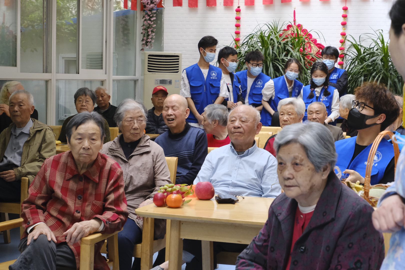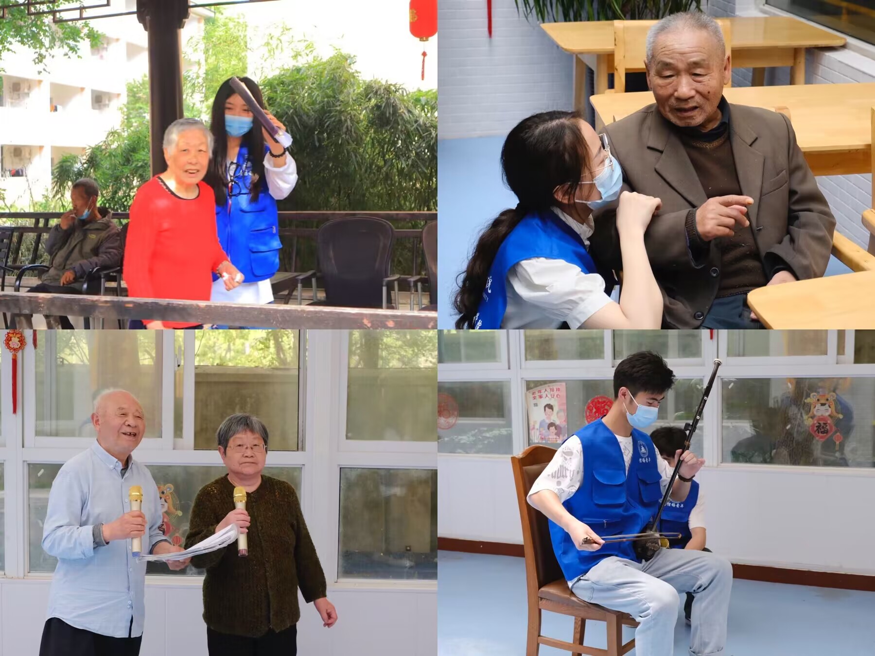颐养院里,志愿者们与老人促膝交谈,了解他们的日常活动和爱好,询问他们的身体状况,并为老人表演了精心准备的唱歌、舞蹈、魔术等节目。表演过程中,老人们受到感染,纷纷上台献唱,军歌嘹亮,民歌悠扬,在动人的乐声中,老人们笑声连连,掌声不断。