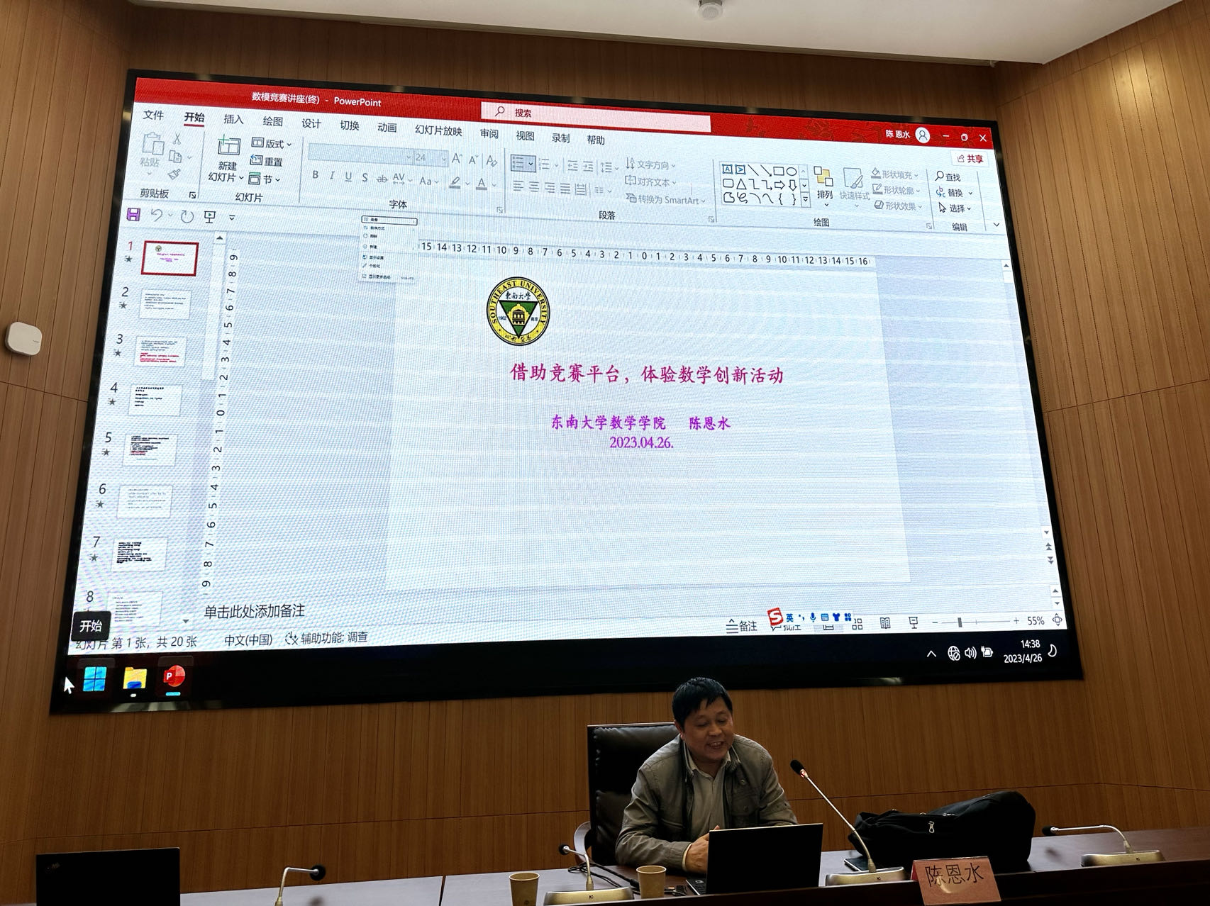 为进一步提高我校学生数学建模能力和实践创新能力,培养团队意识与合作精神,解答学生有关数学建模竞赛的疑惑,4月26日下午,理学院特邀全国大学生数学建模竞赛江苏赛区组委会秘书长、东南大学陈恩水副教授作题为“依托竞赛平台,体验数学创新活动”的专题讲座。数学建模竞赛实验班全体学生以及竞赛团队全体指导教师参加了讲座。讲座由理学院副院长李小玲主持。