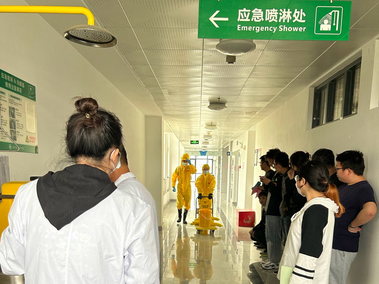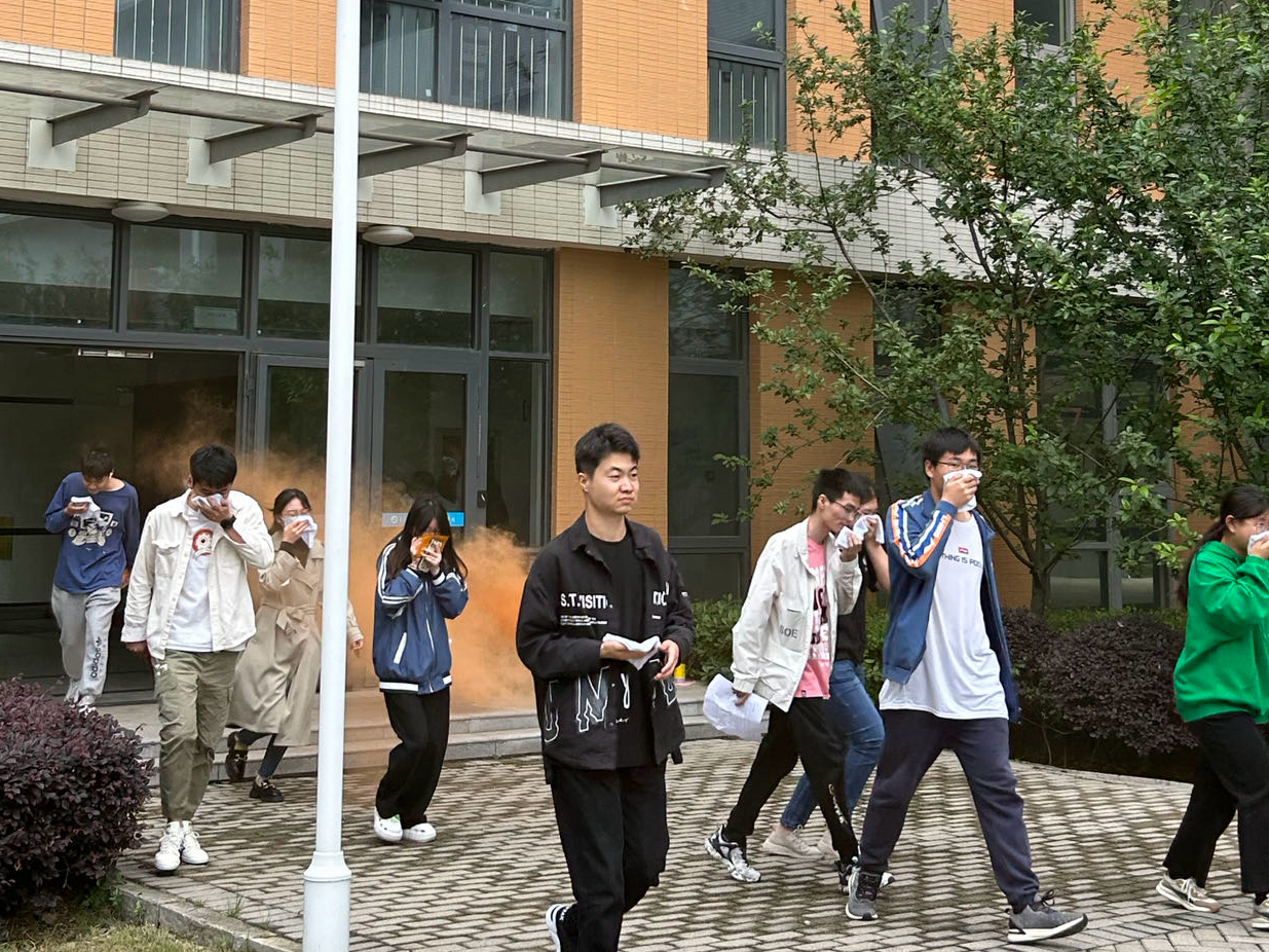 整个演练过程有3个预定场景,一是学生在化学实验室内无意打翻试剂瓶而引发疑似化学品泄漏,由参演师生现场展示化学泄漏后应急处理全部过程;二是学生模拟在实验中触电昏迷后的应急处置;三是针对教学过程中发生特定化学品燃爆事件,开展教学单位初步应急处置和全员消防应急疏散演练。