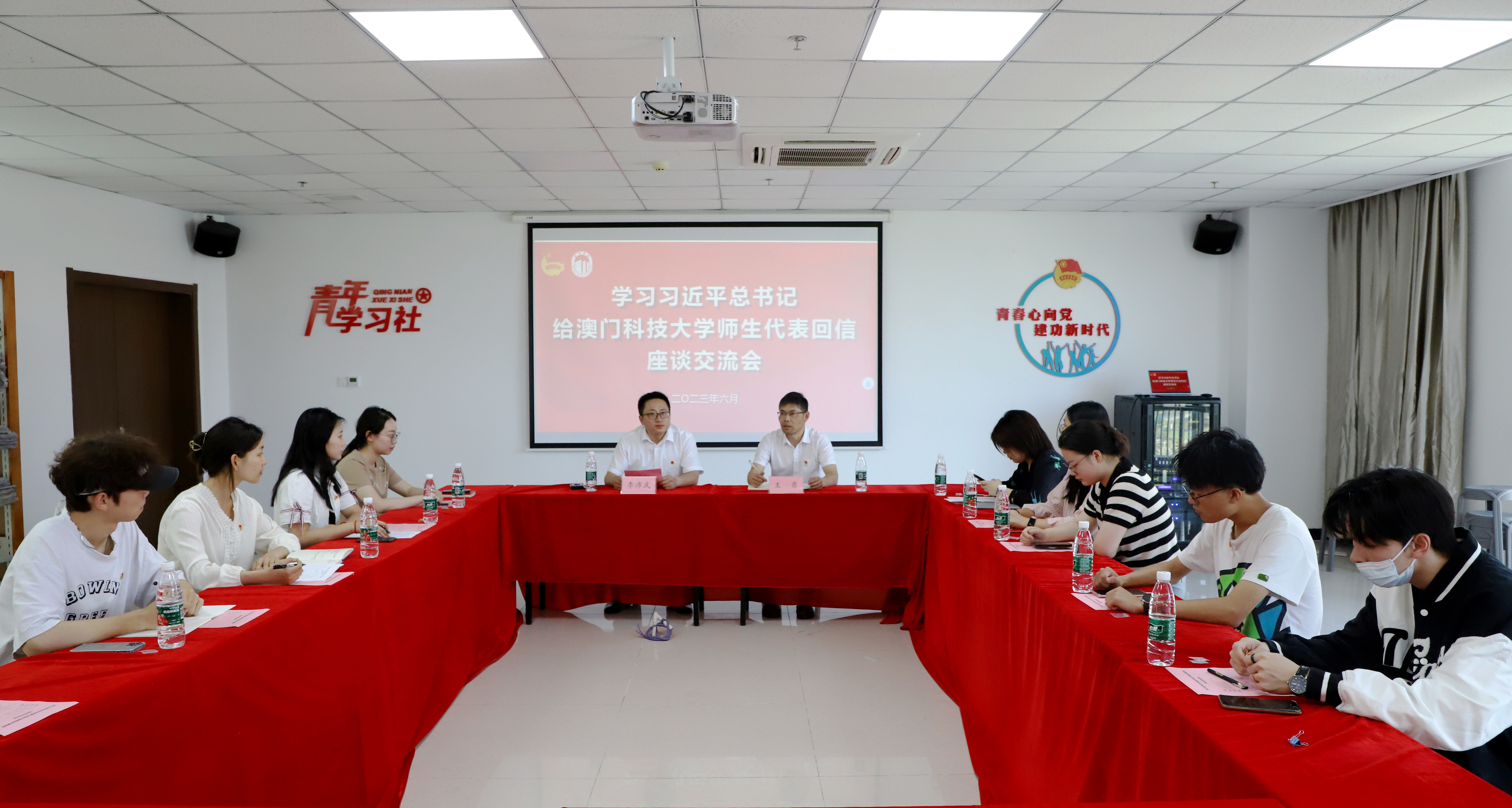 为深入学习贯彻习近平新时代中国特色社会主义思想,激发广大青年关注国家科技创新事业,积极投身中国式现代化建设,6月9日下午,我校在大学生活动中心青年学习社开展学习习近平总书记给澳门科技大学师生代表回信座谈交流会。国际教育学院院长王勇、校团委书记李沛武出席会议,国际教育学院和校团委相关老师、学生代表参加活动,会议由李沛武主持。
