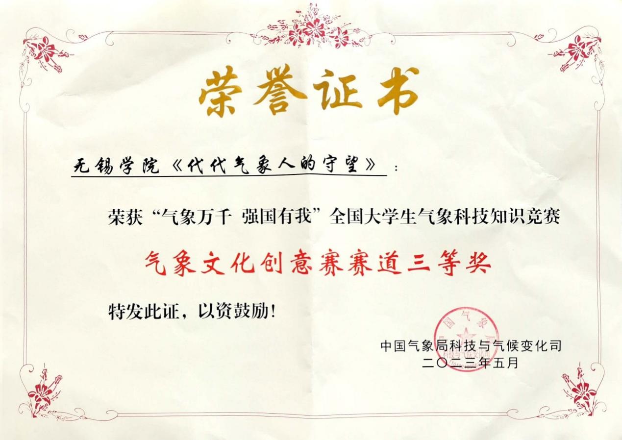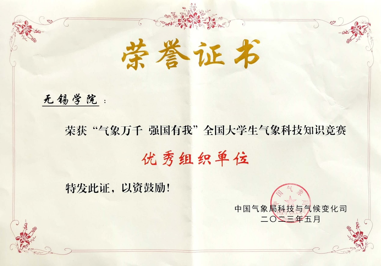 为深入贯彻落实党的二十大精神和习近平总书记关于科技创新与科学普及的重要论述精神,加快推进气象科技创新与气象科普“一体两翼”发展,助力高校气象学科教育,增强青年对我国气象科技创新成就的认同感和荣誉感,5月25日下午,在张国宇老师的带领下,大气与遥感学院学子赴南京参加“气象万千 强国有我”全国大学生气象科技知识竞赛。我校19级大气科学程洋同学、21级大气科学蒋晓莹同学分别以第三、第十一的优异成绩获得个人优秀奖,作品《代代气象人的守望》获得气象文化创意赛道三等奖,无锡学院获得优秀组织单位荣誉称号。