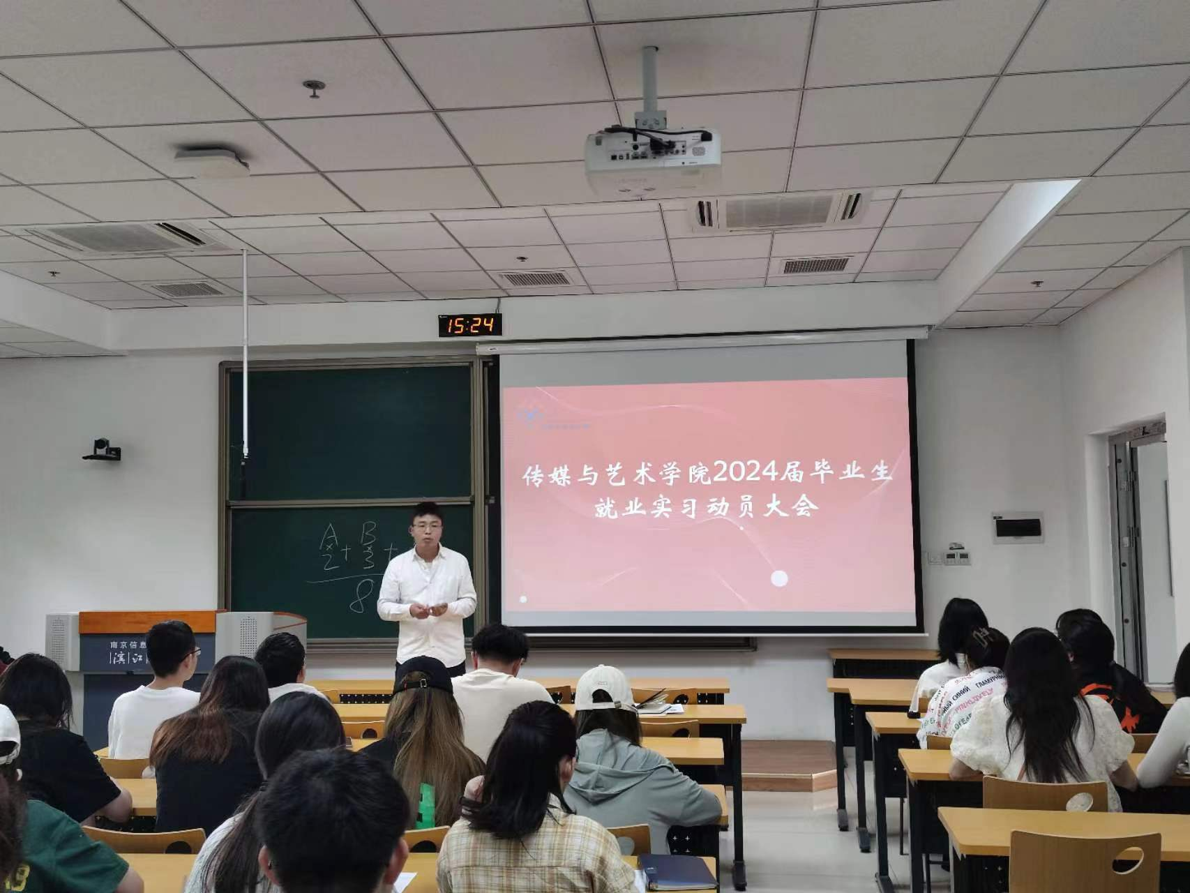 为了进一步推动学生就业积极性,提高就业实习指导的针对性和实效性,传媒与艺术学院于6月13日下午在勤学楼110召开2024届毕业生就业实习动员大会。会议由辅导员张晓娜主持,传媒与艺术学院院长助理陈曦,学院分团委书记郭新宇,国际教育学院吕婷婷、弹弹兽生物科技(无锡)有限公司企业代表及全体2024届数字媒体艺术专业毕业生参会。