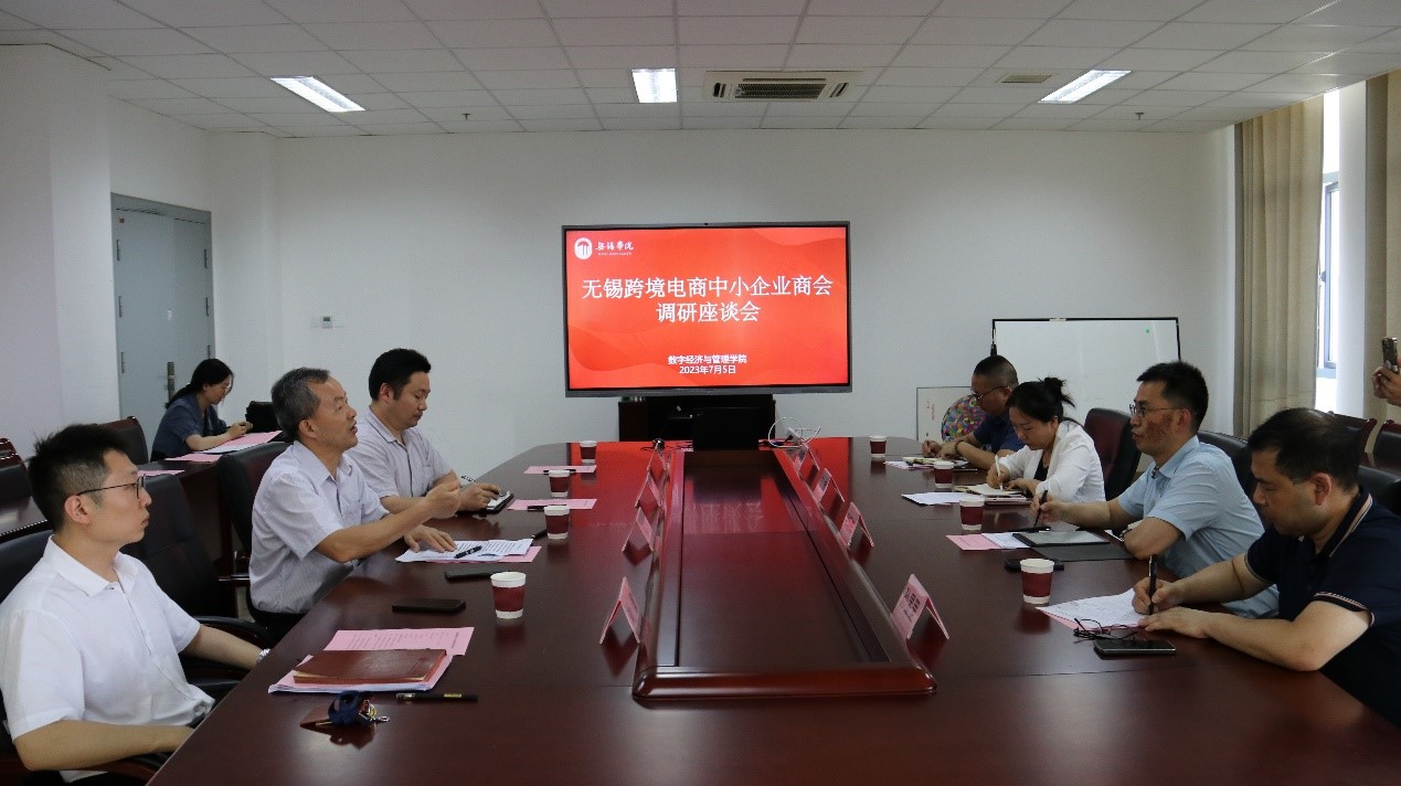7月5日下午,无锡跨境电商中小企业商会会长张晓栋、副会长孙昱罡及商会相关成员来数字经济与管理学院调研交流。数字经济与管理学院院长刘军出席会议。