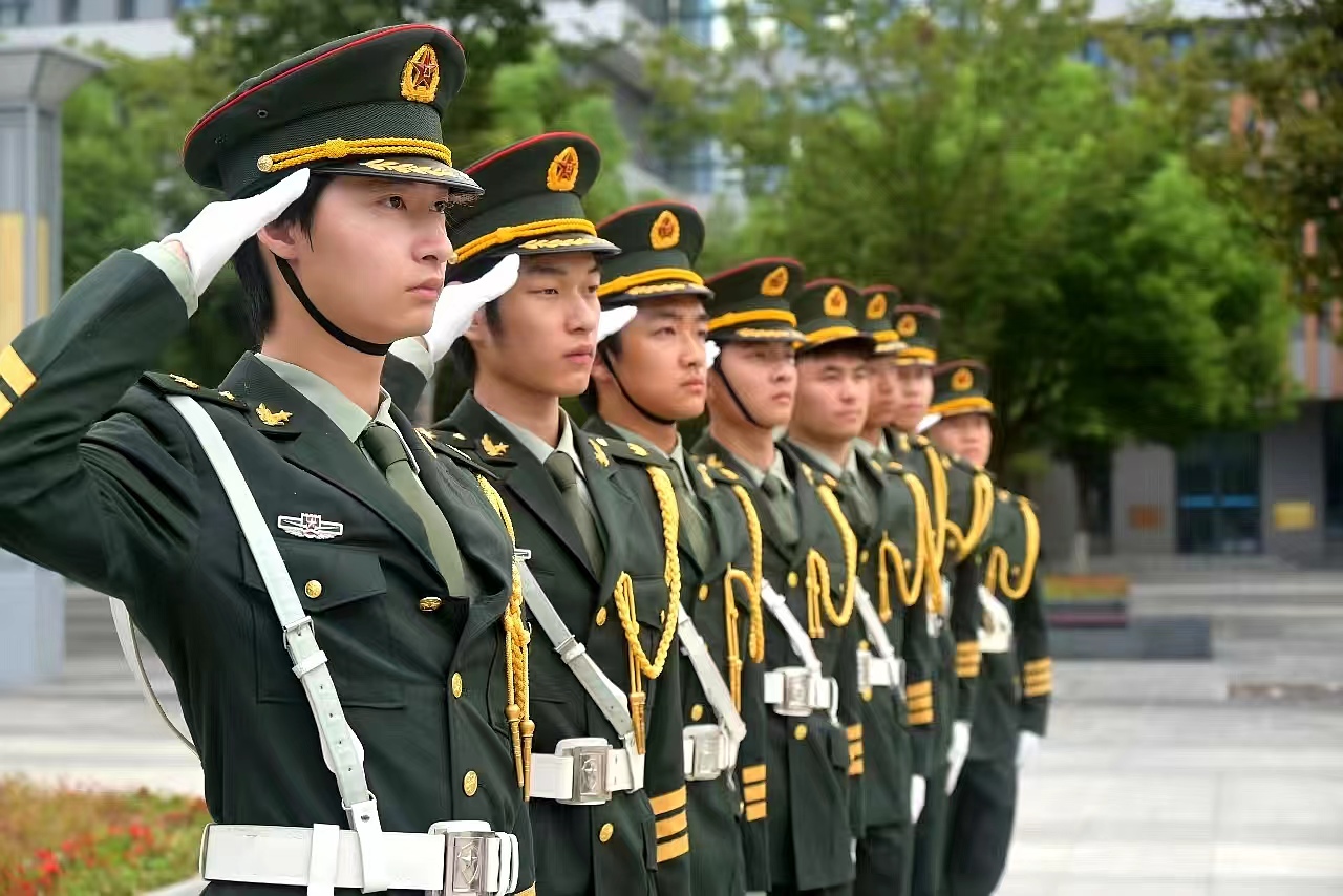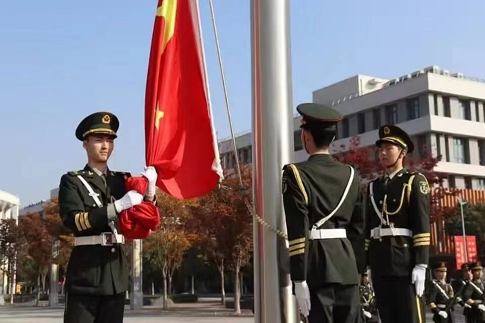 晨光熹微,染得天空半边红。清晨第一缕阳光唤醒大地,七点整,国旗护卫队的队员们身着礼服,在大礼堂前盛装而立。随后,指挥员一声令下,队员们迈着整齐划一的步伐,以昂首挺胸的姿态走向升旗台。