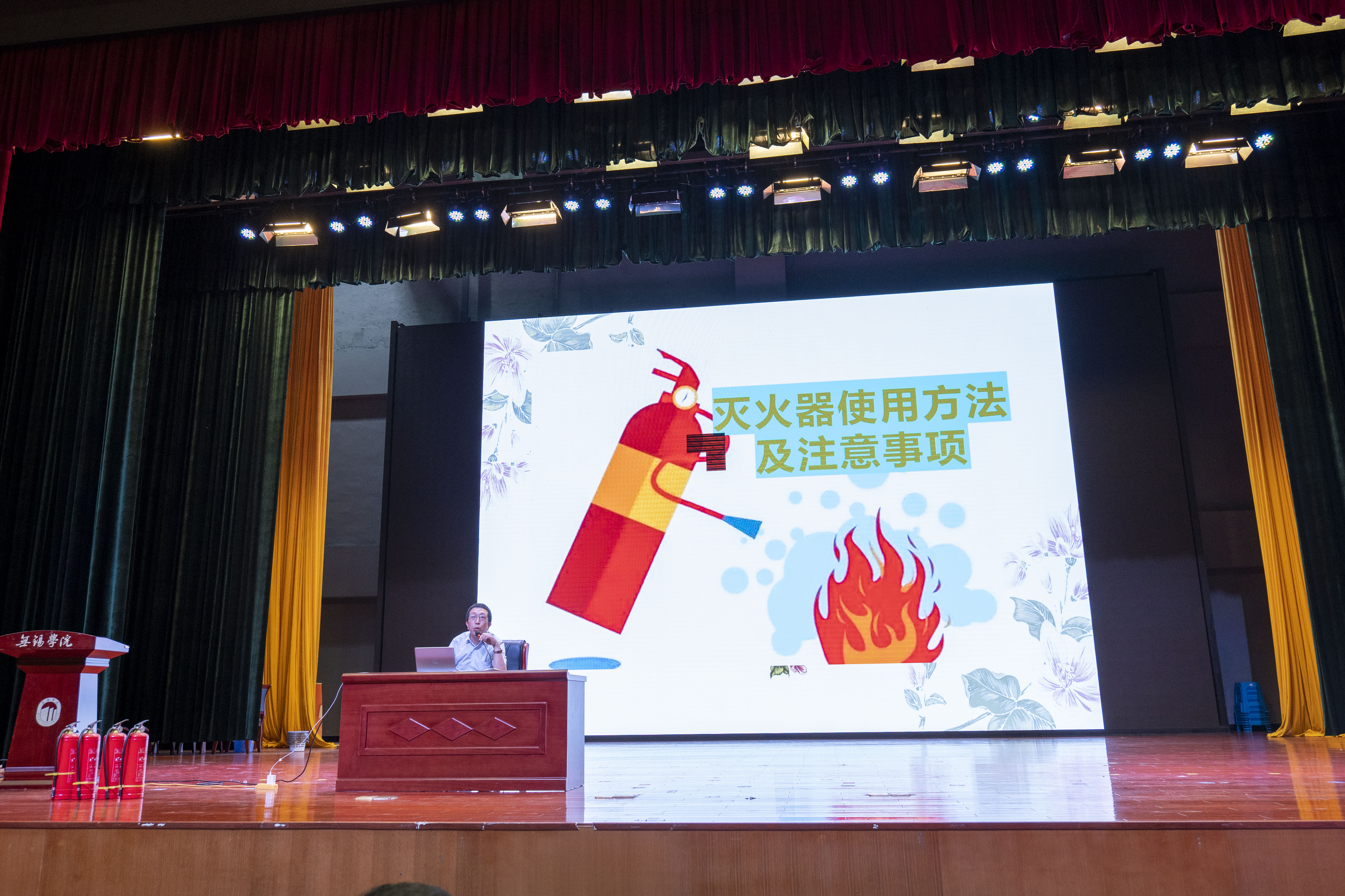 讲座现场,后丽娟老师用浅显易懂的语言生动形象地为同学们详细讲解了心肺复苏术、AED使用、气道异物解救三个专题的知识,并邀请现场同学一起“手把手”为大家演示施救过程的具体细节。随后,花平老师就火灾的预防和应急处置、灭火器等消防器材的正确使用方法以及疏散逃生的基本常识进行重点讲解。