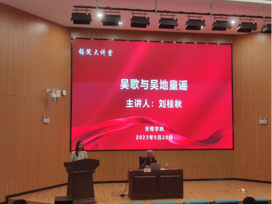 9月20日下午,“锡院大讲堂”第二期在图书馆学术报告厅举行。图书馆邀请了江苏省优秀教育工作者、无锡文化研究专家刘桂秋副教授作题为“吴歌与吴地童谣”的专题报告。讲座由图书馆(档案馆)馆长助理胡颖文主持。