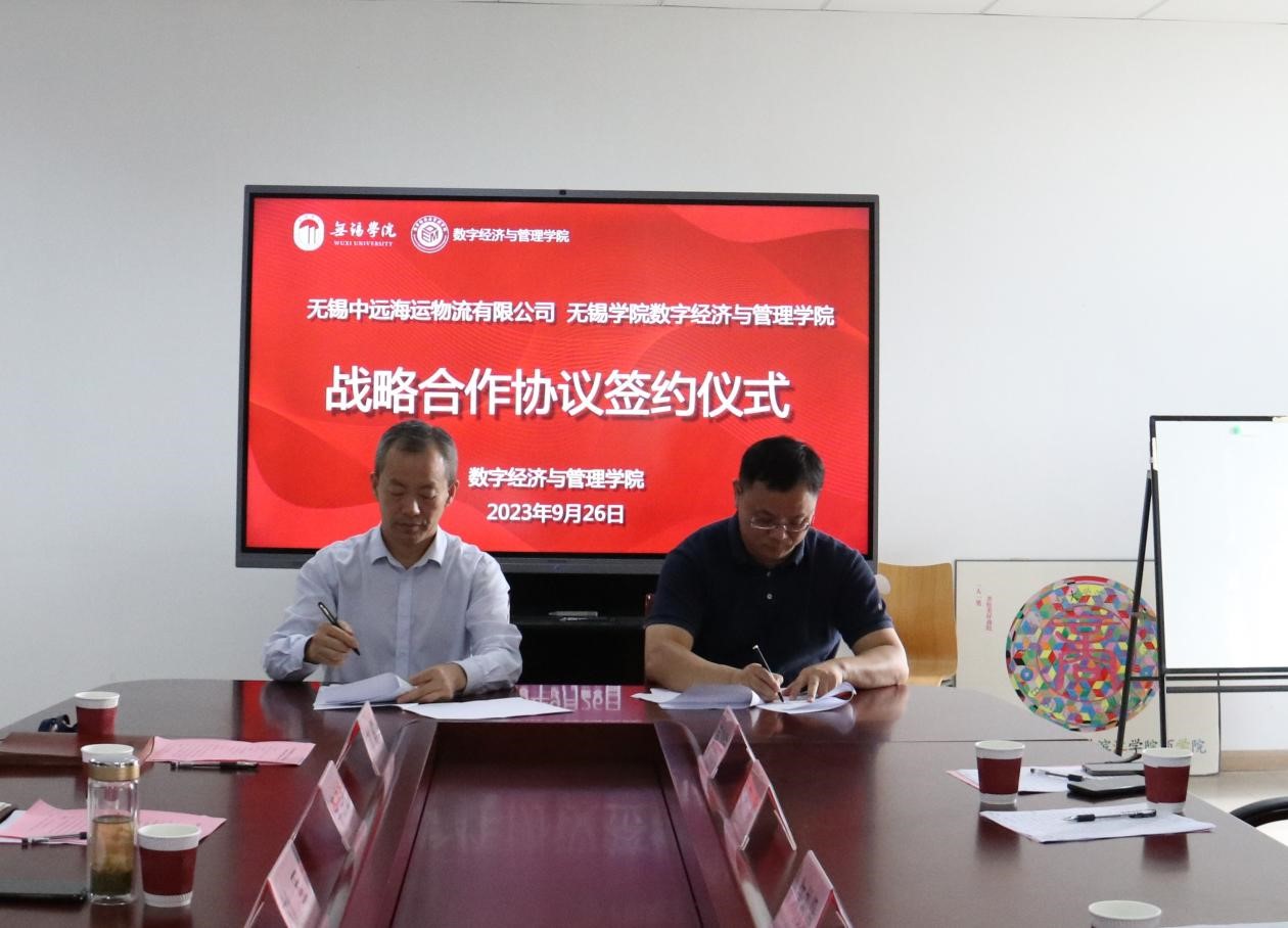 9月26日上午,数字经济与管理学院与无锡中远海运物流有限公司举行战略合作协议签约仪式。无锡中远海运物流有限公司总经理朱礼贤、支部副书记邱佐明,数字经济与管理学院院长刘军、党总支副书记李诗雅及教师代表参加会议。